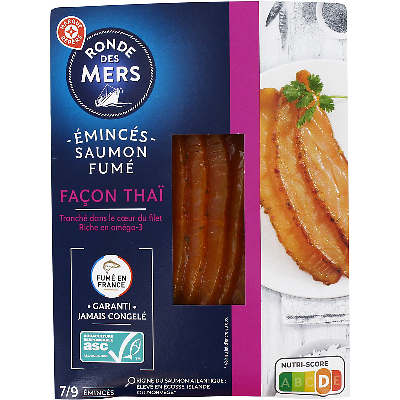 Émincés de saumon atlantique (Salmo salar) élevé en Ecosse (Royaume-Uni), Islande ou Norvège*, fumé au bois de hêtre, aux épices et plantes aromatiques. * Pays d'élevage : voir ci-dessous. RONDE DES MERS