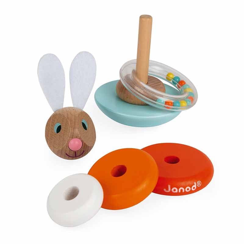 Un lapin à recomposer en empilant les différentes pièces en bois pour obtenir un joli culbuto. Un anneau avec des billes colorées qui tintent joyeusement lorsque le lapin bouge ! Les oreilles du lapin sont en feutrine pour un toucher tout doux ! Bois : hêtre, merisier et pin. Oreilles en feutrine. Anneau et billes en plastique. Boîte fermée.