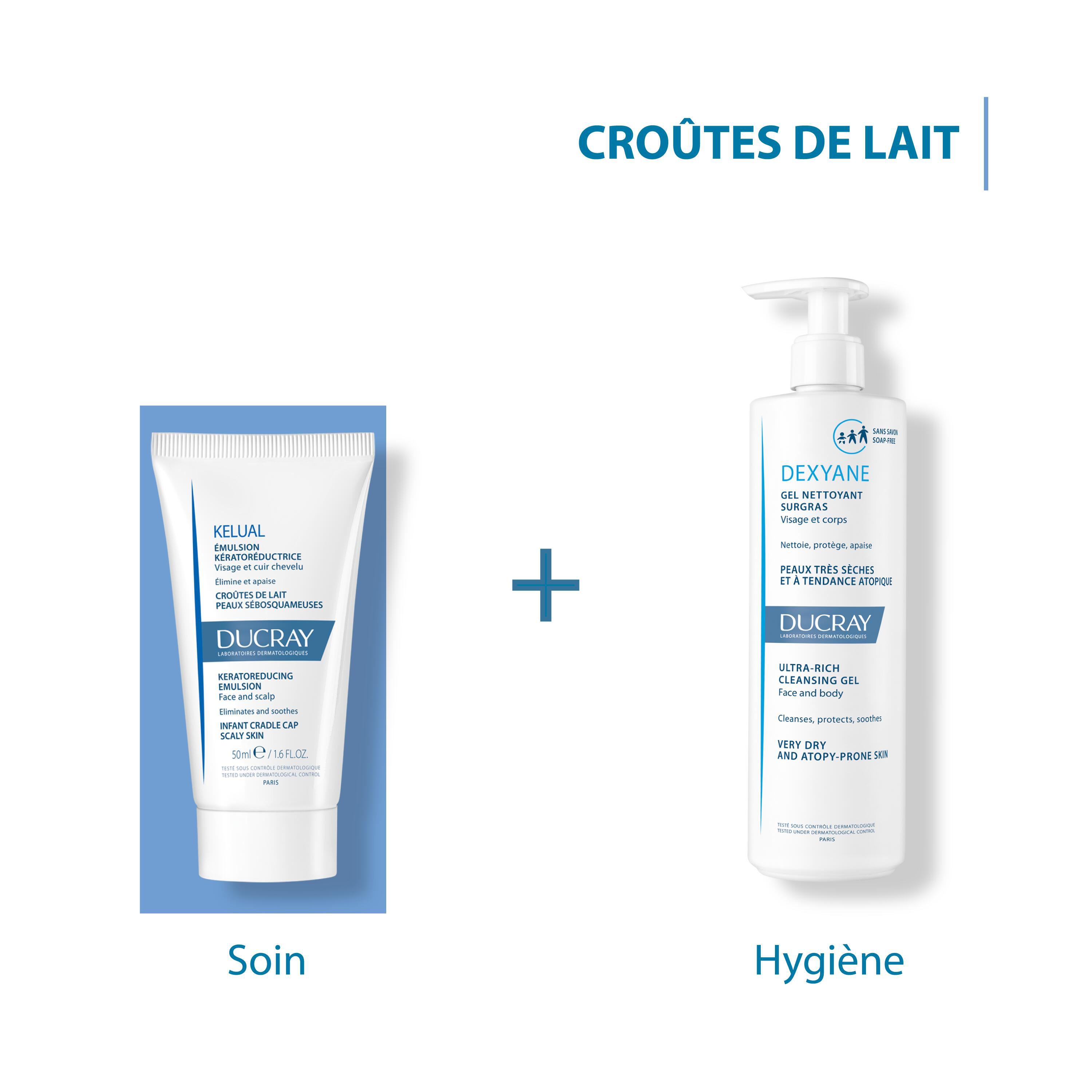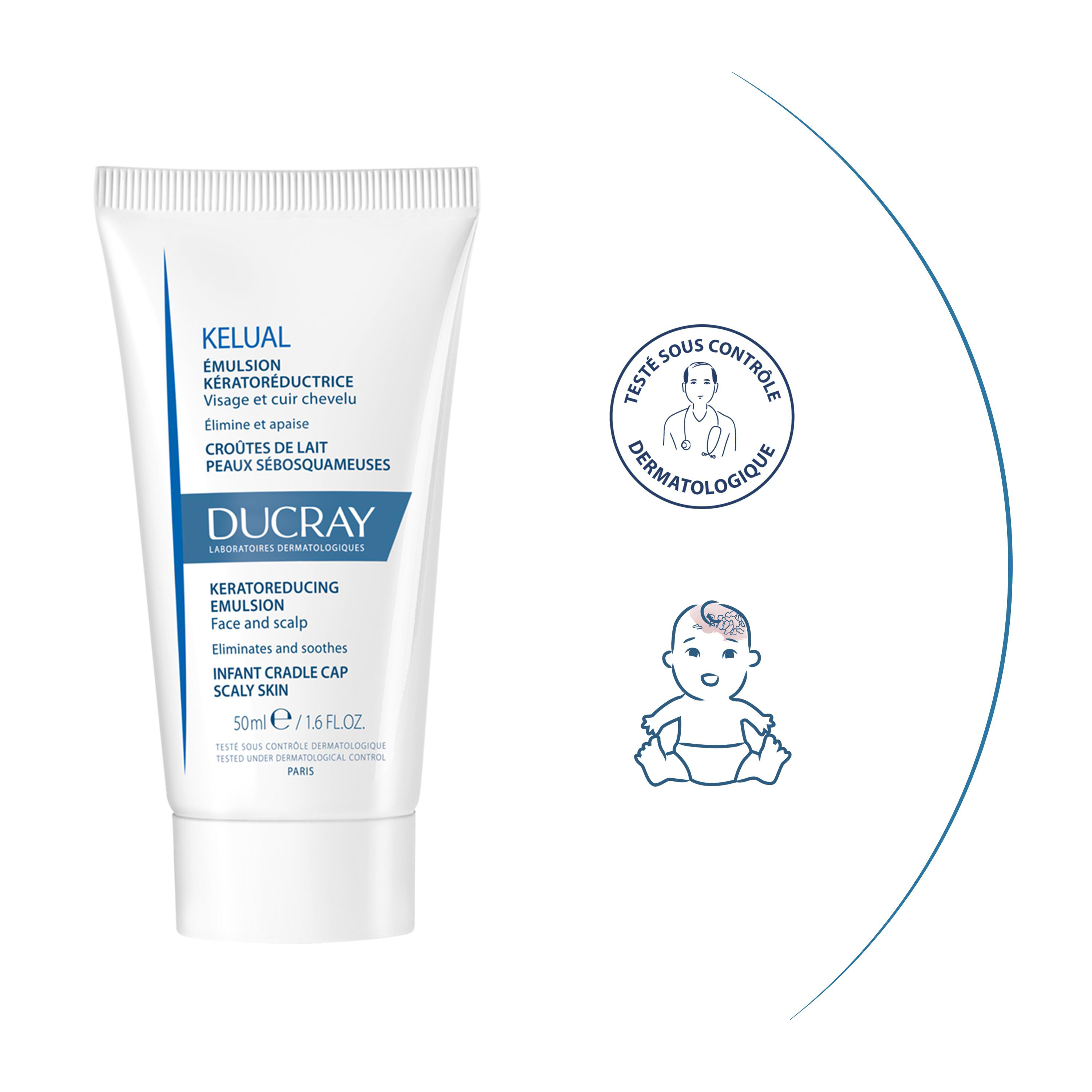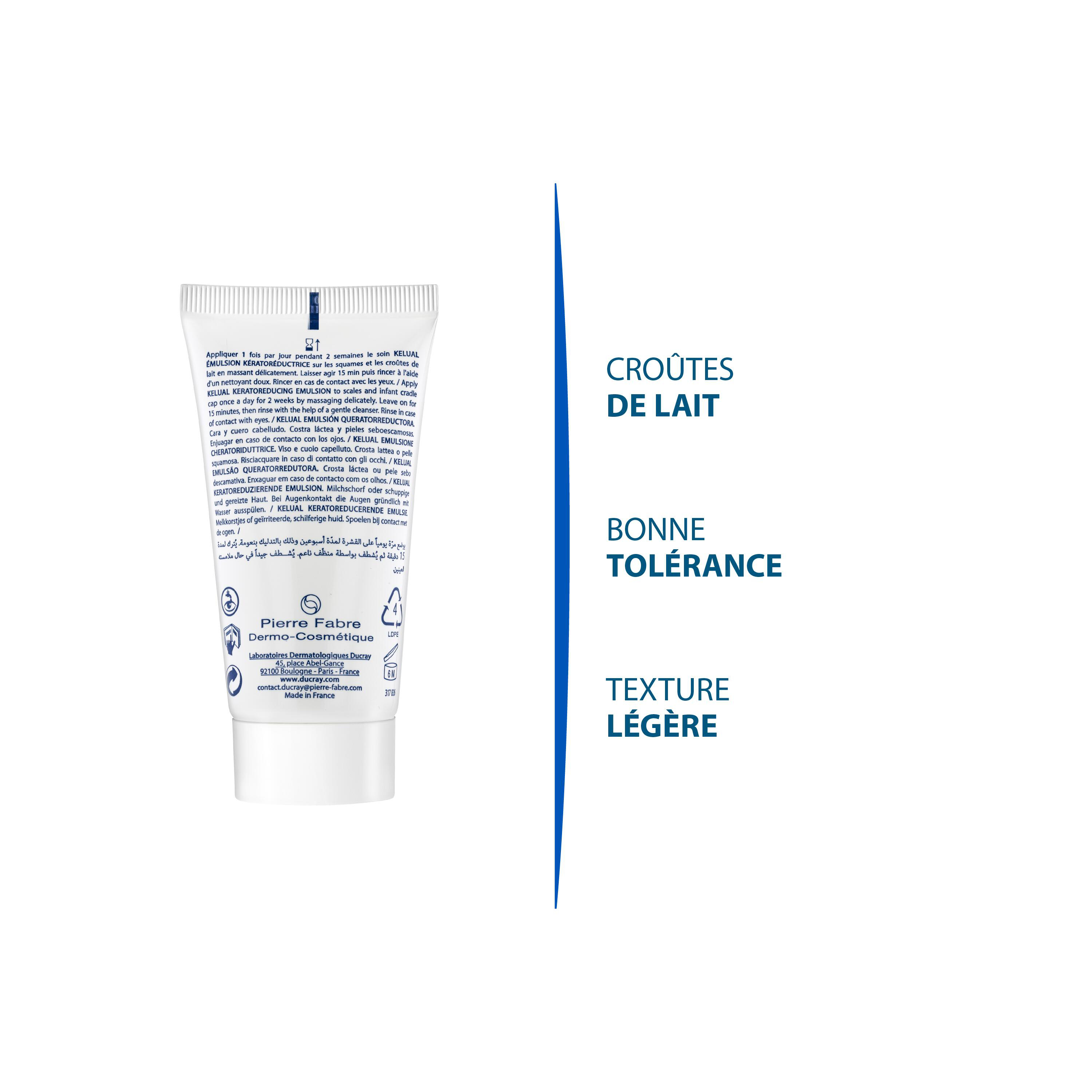 Ducray Kelual Émulsion Kératoréductrice Croûtes de Lait Peaux Sébosquameuses Nourrisson Bébé 50 ml élimine les squames et apaise l'irritation du visage et du cuir chevelu. Cette émulsion contient une substance active brevetée, bien tolérée, le Keluamid, qui favorise l'élimination de squames. Utilisée comme complément du traitement des dermites séborrhéiques et des croûtes de lait chez le nourrisson, Kelual émulsion soulage les démangeaisons et calme les érythèmes qui accompagnent souvent ce états irritatifs.