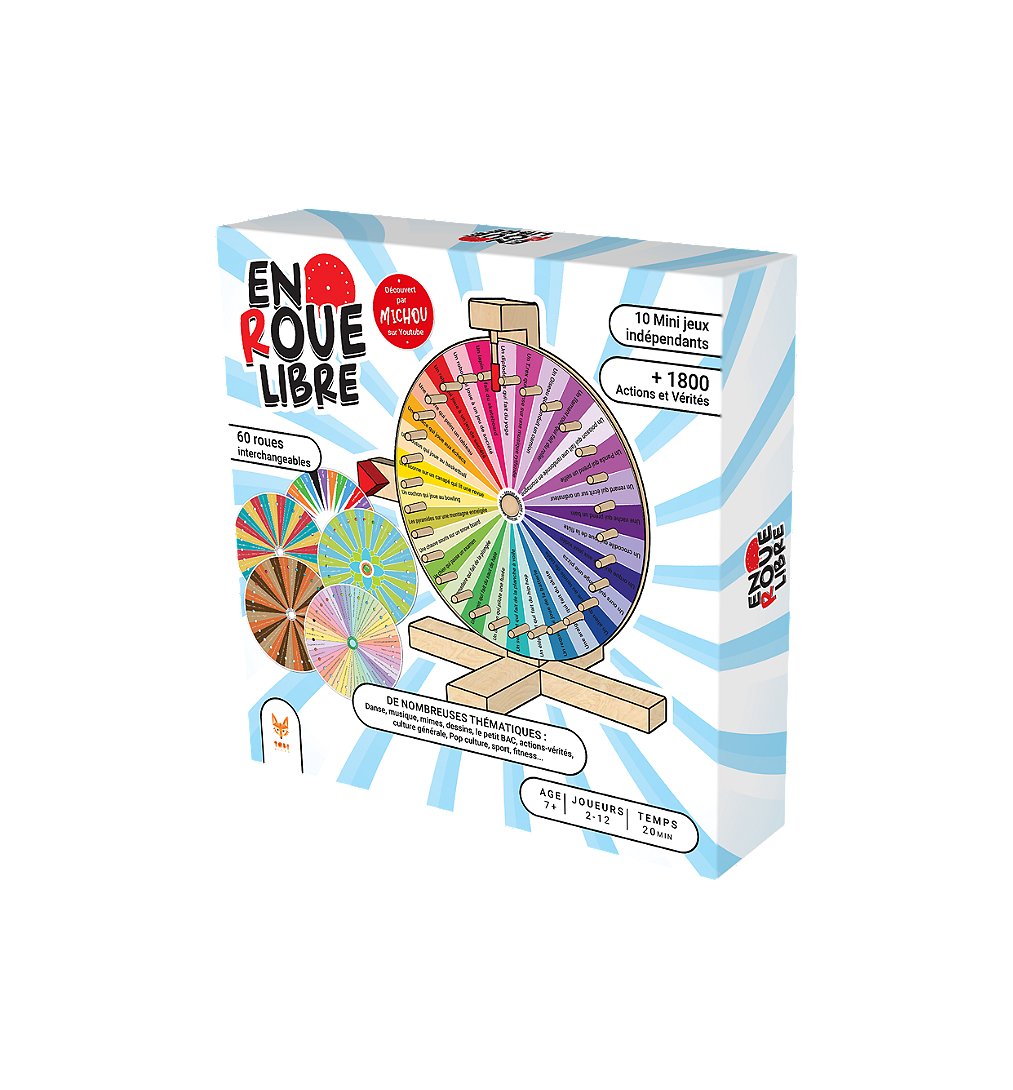 Faites tourner la roue et amusez vous ! Relevez un des 1800 défis actions ou vérités du quotidien ! Choisissez six des 60 roues et démarrez la partie avec 5 vies. Tournez la roue, éliminez vos adversaires et soyez le premier à gagner le plus de vies en fin de partie. 60 roues sont proposées selon votre âge (à partir de 3 ans, 7 ans, 12 ans et adultes). Vous pouvez aller encore plus loin dans vos discussions et mettre une véritable ambiance lors de vos soirées avec ces 60 roues et les 10 mini jeux indépendants, indispensables pour des moments divertissants, drôles, imprévisibles et conviviaux en famille ou entre amis. En roue libre est un jeu simple où chaque disque est composé de 30 actions ou vérités à réaliser par les joueurs lorsqu’ils tournent la roue. - 15 roues vérités pour apprendre à mieux se connaître -15 roues défis délirants pour une ambiance déjantée - 30 roues de questions et de mini jeux variés à jouer avec vos proches ou au bureau avec vos collègues sur les thèmes suivants : Danse / Musique / Mimes / Dessins / Émotions / Pop culture / Roue de la fortune / Couple / Sport / Yoga / Casino / Cuisine / Imitation de Bruit / Jeu du petit Bac sans oublier les Roues des questions sur la Culture Générale où tout le monde a sa chance : Histoire / Géographie / Mathématiques / Langues étrangères / Littérature / Sciences / Peinture / Philosophie et bien plus encore ! Votre savoir seul ne vous sauvera pas, c’est votre audace et votre talent qui feront la différence pour gagner. Comme dans la vie, la roue tourne et vous pourrez bien être le suivant à sauter.