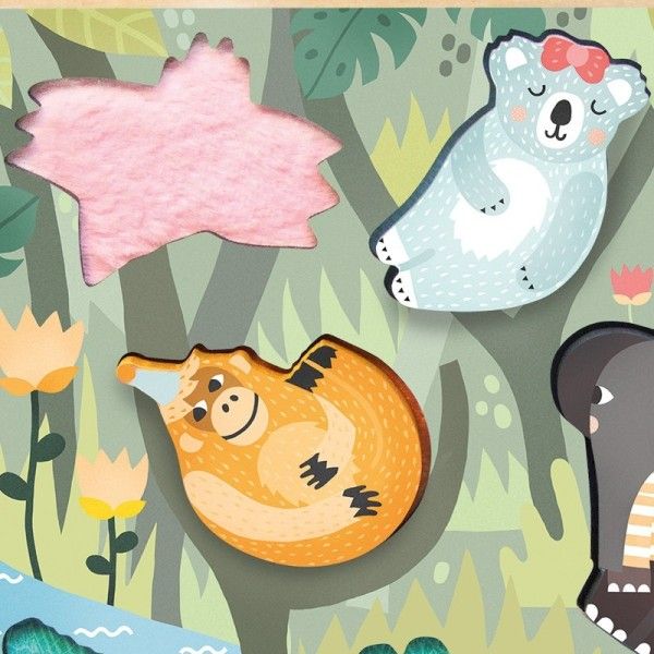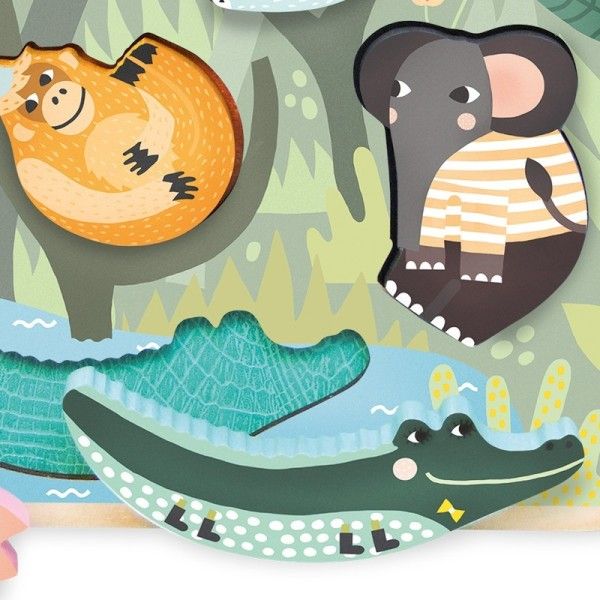Un encastrement poétique sur le thème de la jungle dessiné par Michelle Carlslund. Les textures animalières sont à découvrir quand on soulève les pièces. Les animaux feront également de très bons compagnons de jeux.