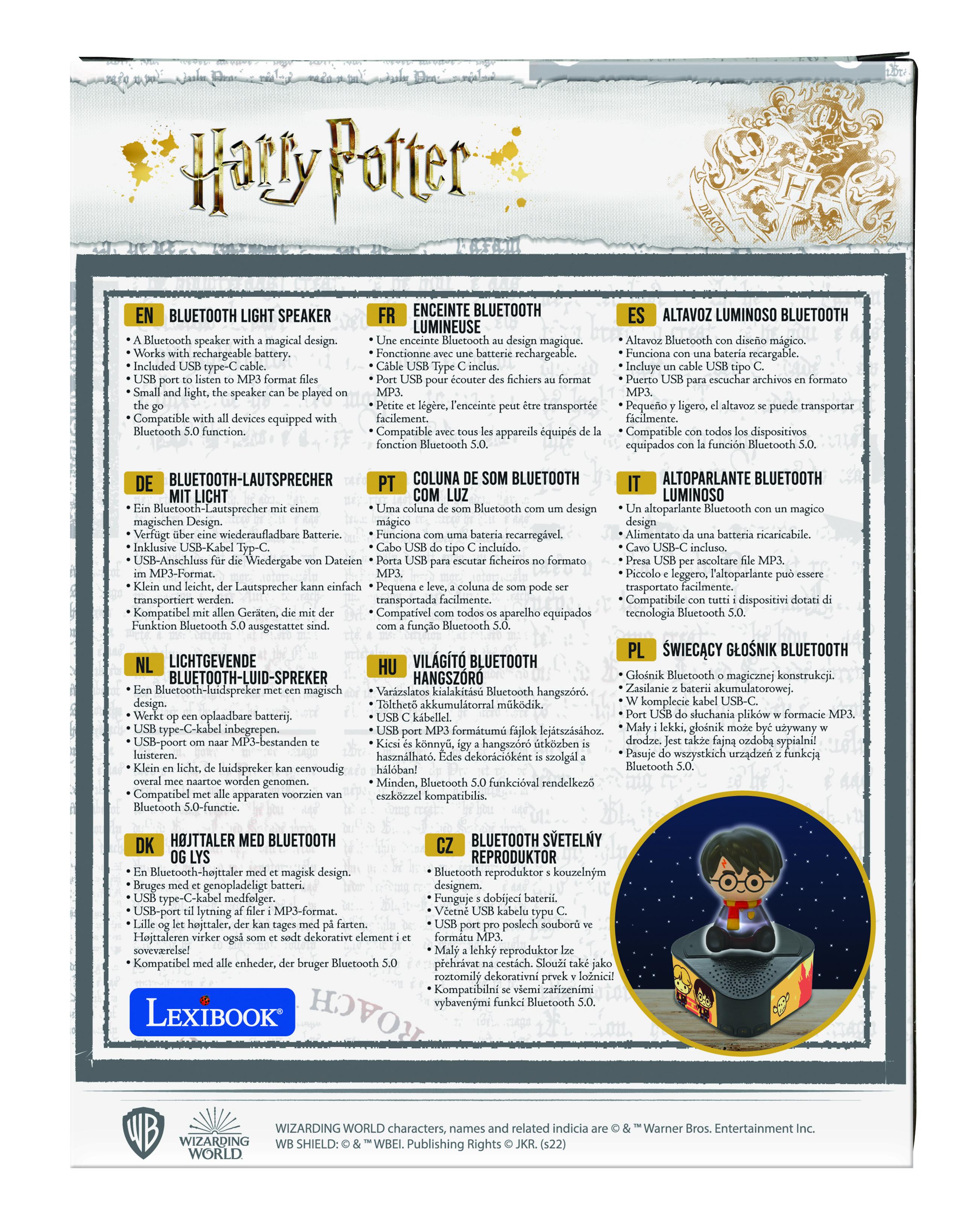 Une enceinte Bluetooth au design magique Harry Potter ! La figurine Harry Potter s’illumine au rythme de la musique ! Légère, design et facilement tranportable ! Compatible avec tous les appareils équipés de la fonction Bluetooth 5.0 Fonctionne avec une batterie rechargeable - Câble USB Type C inclus.