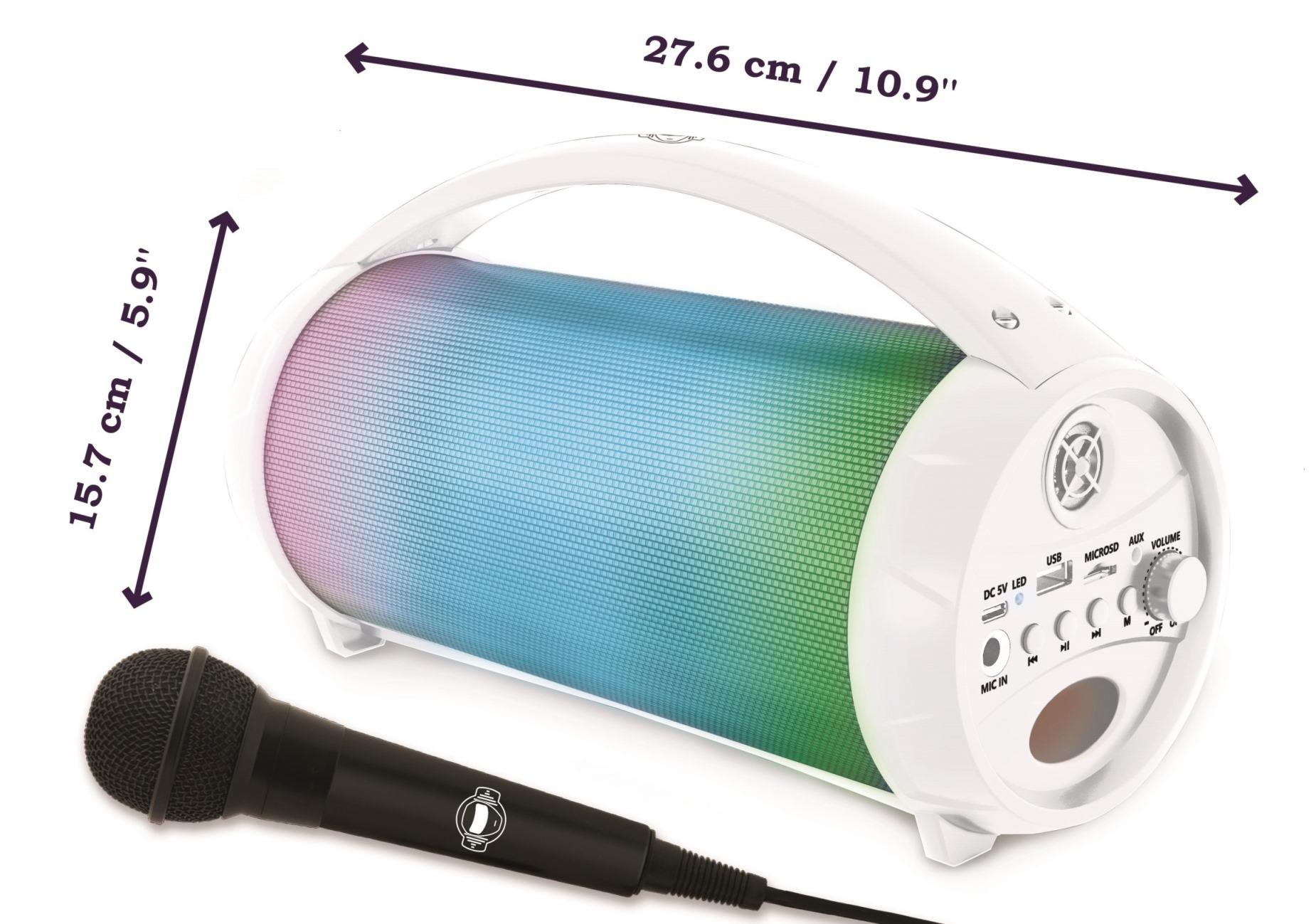 *Enceinte Bluetooth 5.0 : fonctionne sans-fil avec tous les appareils équipés du Bluetooth comme les smartphones ou les tablettes. *Puissant haut-parleur de 4 watts (RMS) pour créer une ambiance de folie ! * Des effets lumineux multicolores incroyables ! * Grâce à son micro inclus, l’enceinte fait aussi karaoké. * Port carte micro SD/TF, port USB pour brancher une clé USB, et port Aux-IN pour connecter un périphérique audio. * Fonction TWS : synchronisez-en 2 ensemble pour profiter d’un son stéréo. * Batterie rechargeable 1200 mAh pour plusieurs heures d’utilisation en continu ! * Dimensions du produit: 27.6 x 11.7 x 15.5 cm