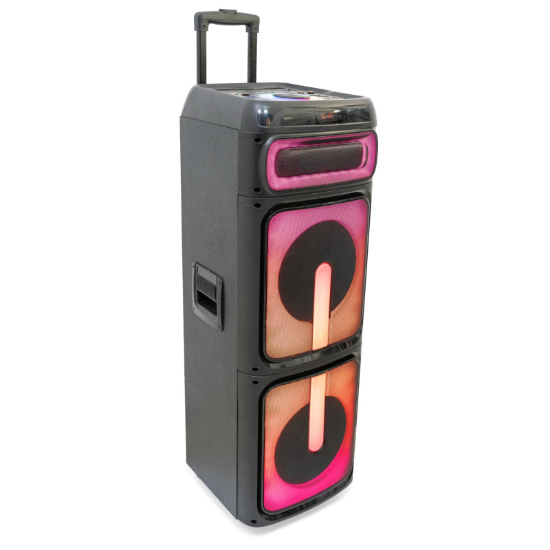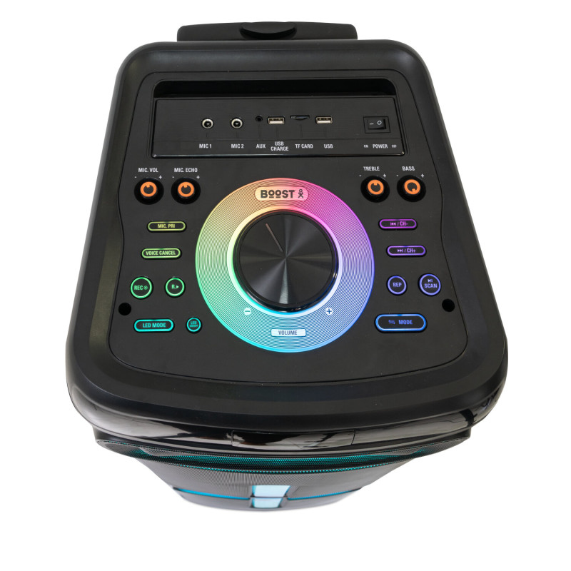 Grande enceinte puissante qui séduit par les jeux de lumière en façade et les commandes lumineuses sur le dessus. Elle crée une ambiance de fête lors de vos soirées Karaoké mais sait aussi se montrer discrète pour une utilisation quotidienne dans votre salon.
