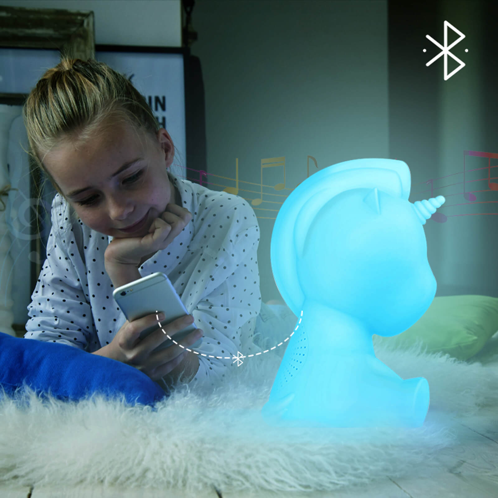 Enceinte Bluetooth Lumineuse de Bigben en forme de licorne. Puissance sonore 15W. Plusieurs couleurs et intensité réglable. Autonomie 8h. Télécommande incluse. Lecteur USB et entrée Jack 3.5mm.
