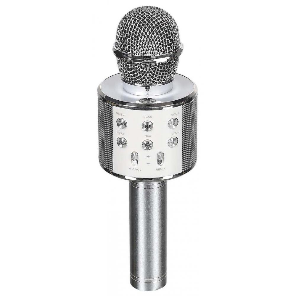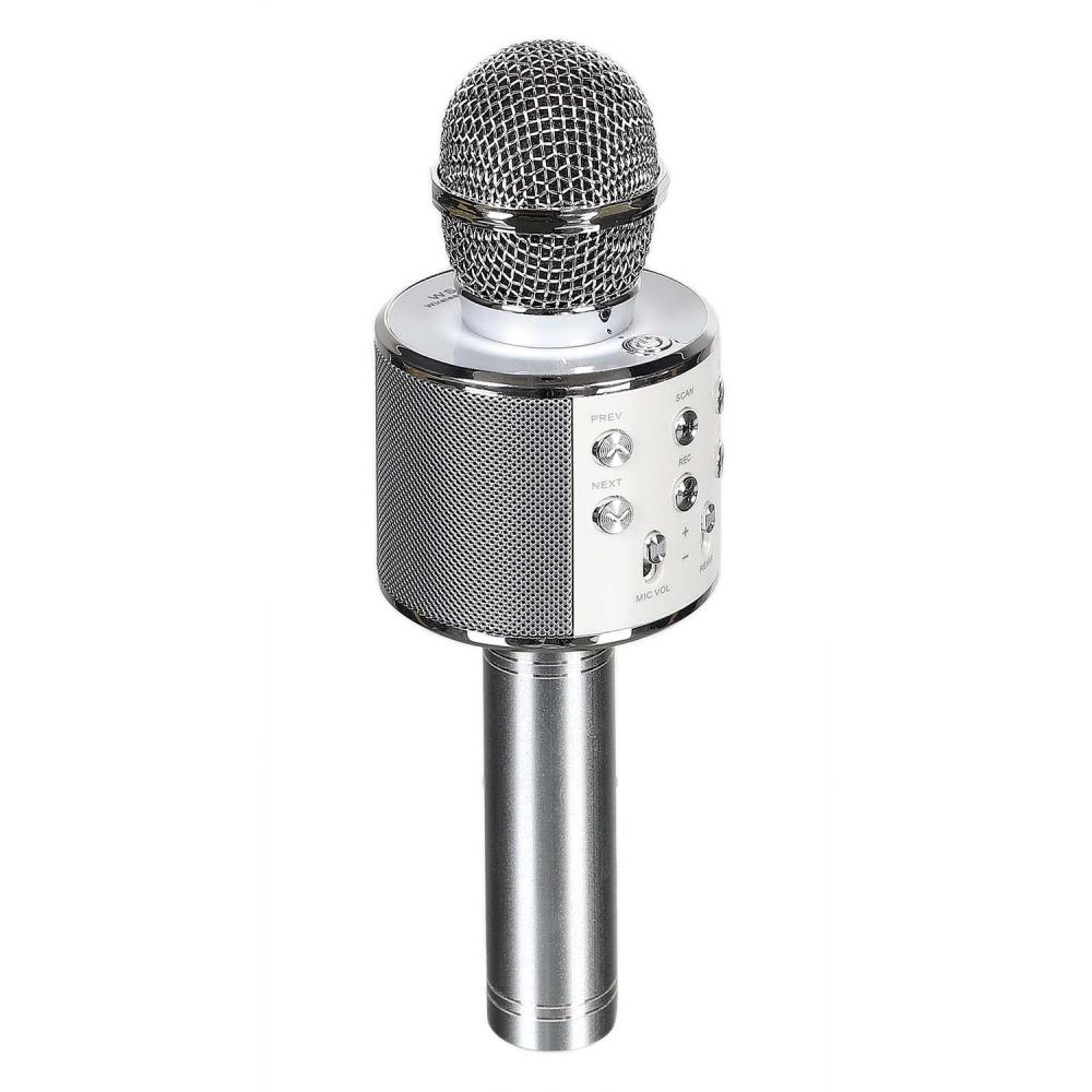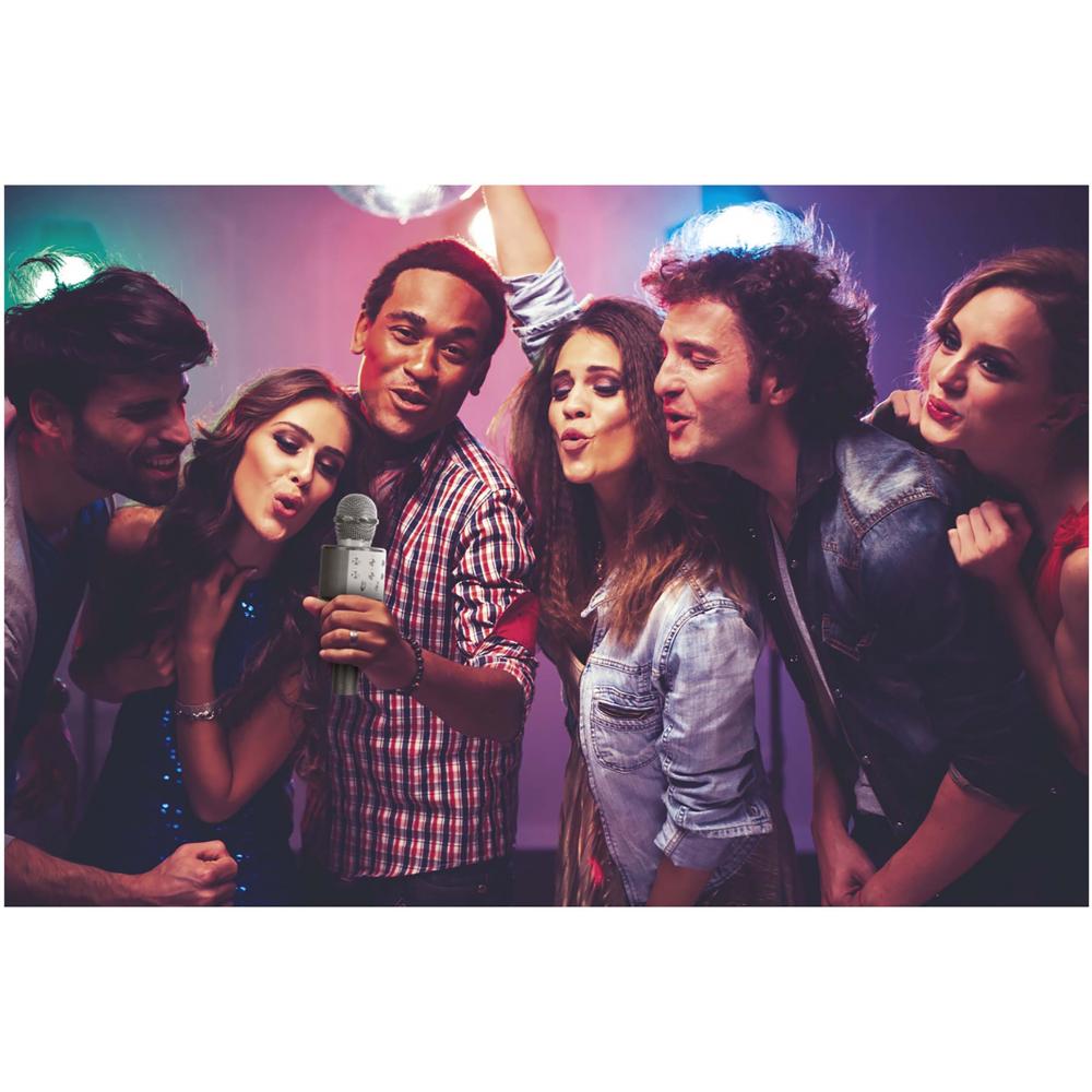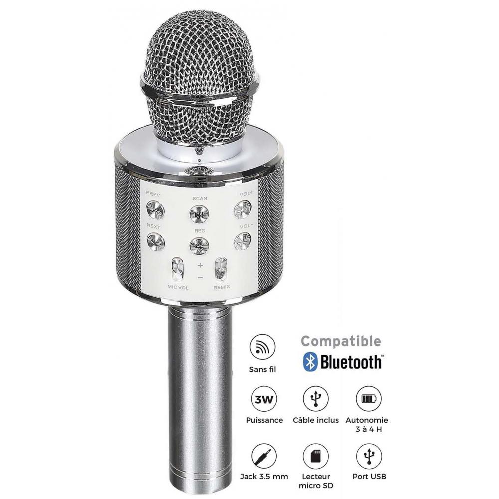 Plus produit Enceinte micro karaoké sans fil 3W, compatible Bluetooth, effets vocaux (voice change), port USB et lecteur micro SD, prise jack 3,5 mm, autonomie 3–4 h, câble USB inclus