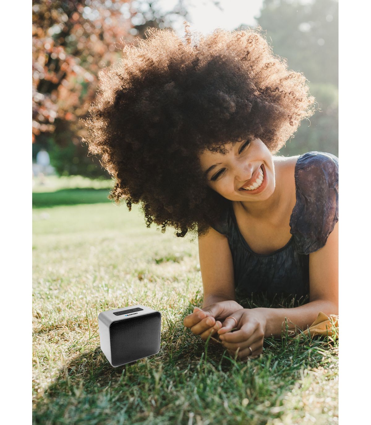 Jolie mélange de matières et de couleurs pour une petite enceinte ultra fonctionnelle. Elle vous permet d'écouter la musique de votre téléphone sans fil via Bluetooth. Sa petite taille est un véritable atout, elle peut être utilisée n'importe où, au bureau, chez vous ou en extérieur ! Son design métal apporte une touche d'élégance, combiné à une qualité de son exceptionnelle grâce à son subwoofer pour former un accessoire hors du commun. C'est simple, vous ne pourrez plus vous en passer !