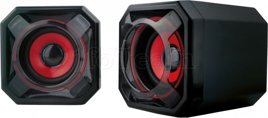 | Plus produit | Enceintes PC compactes 2.0, alimentation USB, entrée Jack 3,5 mm, 2x2.5 W RMS, réponse 80–20 000 Hz, design noir mat avec grille transparente et drivers rouges |