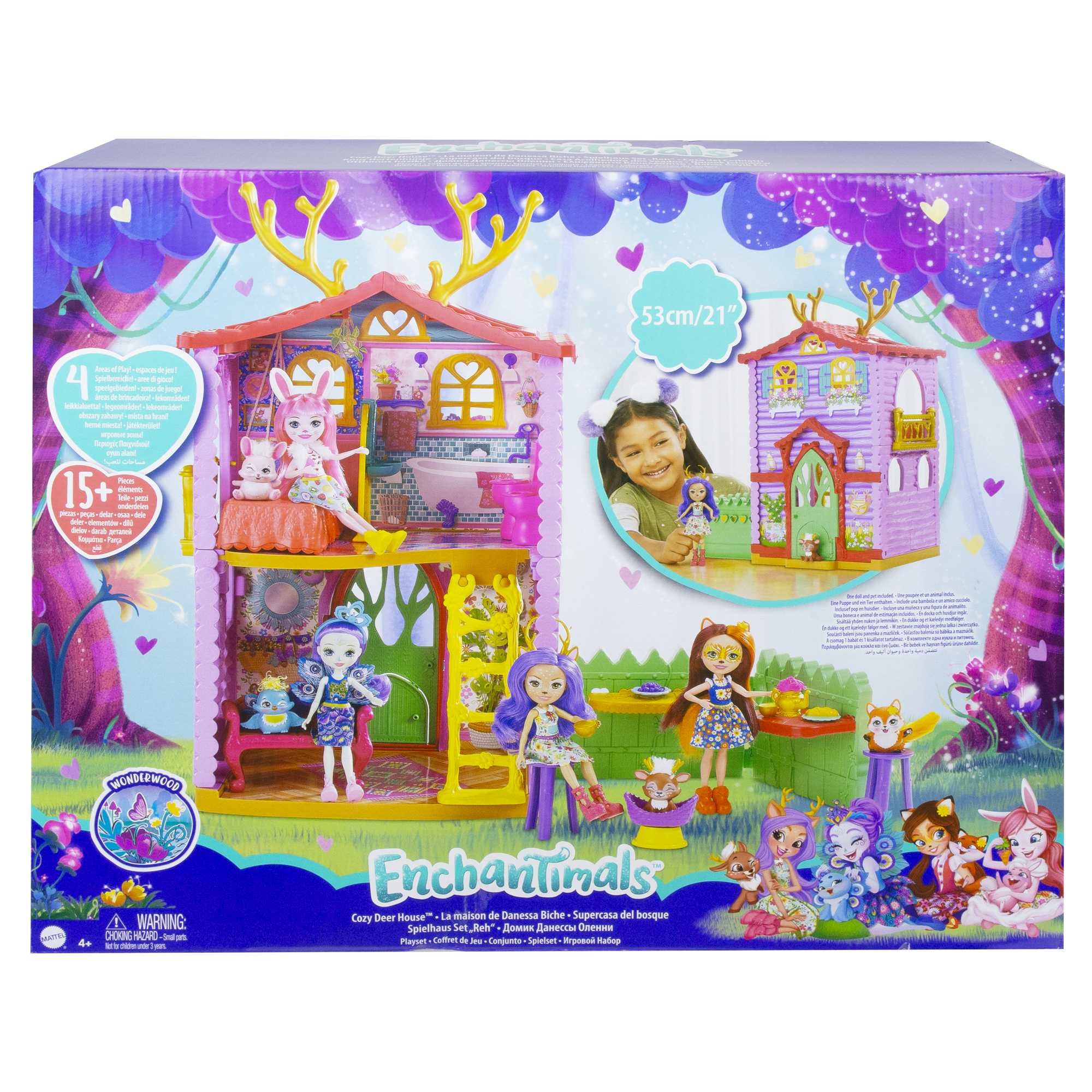 Bienvenue dans la Nouvelle Maison de Danessa Biche des Enchantimals ! Avec 4 espaces de jeu et plus de 15 accessoires, ce coffret de 53 cm de haut offre le décor idéal pour imaginer mille et une belles histoires. Danessa Biche et son inséparable amie Sprint aiment partager des moments de détente à la maison ! Dégustez des encas dans la cuisine d’été, blottissez-vous confortablement dans le canapé du salon, préparez-vous ensemble dans la salle de bains et faites de beaux rêves dans la chambre à l’étage. Invitez d’autres amis Enchantimals pour vous amuser encore plus ! (Tous vendus séparément.) Les enfants pourront faire vivre l’amitié unique qui unit les Enchantimals avec la poupée Danessa Biche et sa meilleure amie Sprint dans leur maison chaleureuse ! Les couleurs et les décorations peuvent varier.