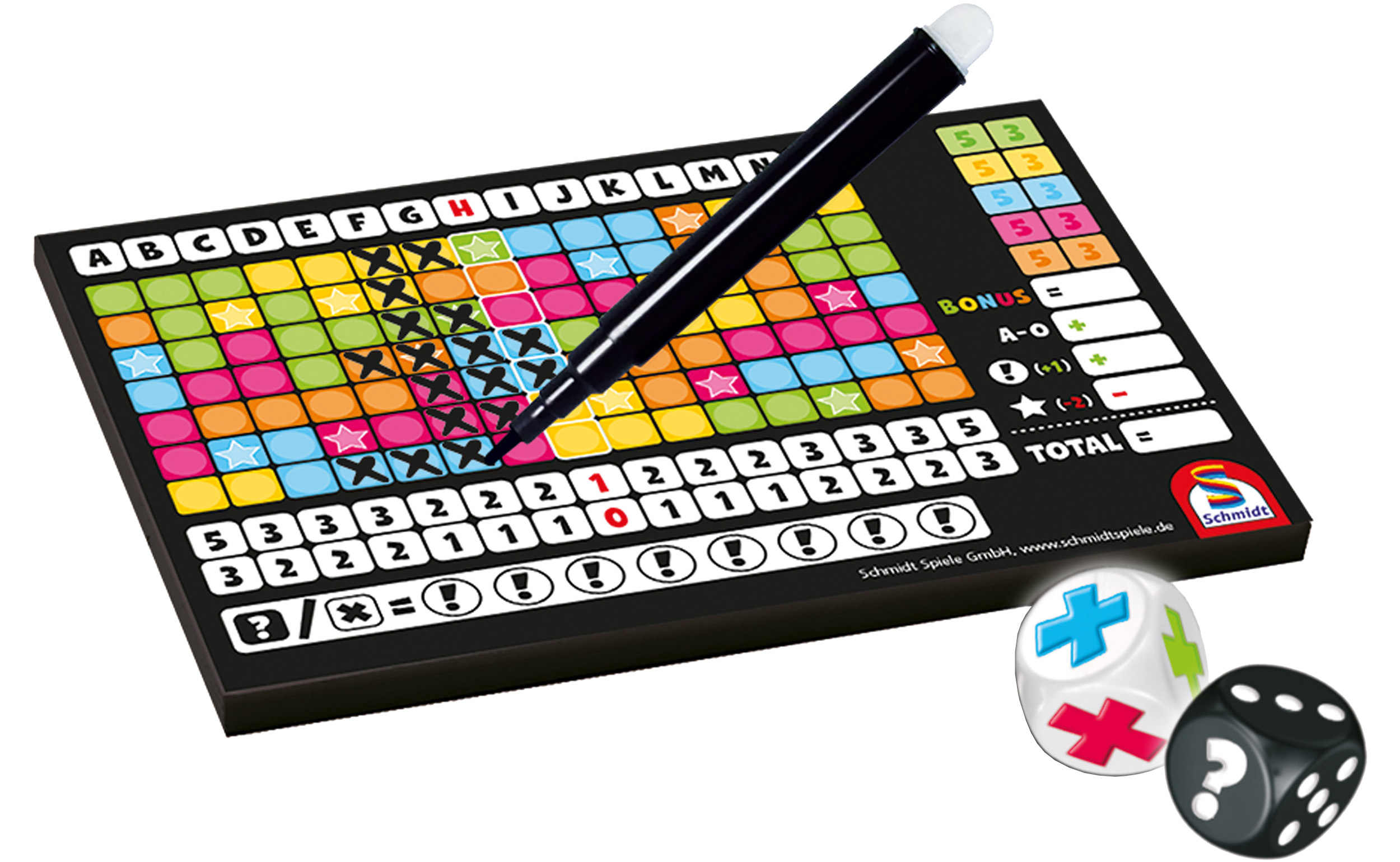 Un joueur lance les 6 dés, en prend deux et coche le résultat. Les autres joueurs choisissent 2 des 4 dés restants et cochent des cases sur leur feuille de jeu. Seules les colonnes complètes apportent des points. Il s’agit donc de bien peser le pour et le contre et de faire les bons choix. « ENCORE ! » est un jeu génial … on y rejoue encore et encore. On ne fait jamais qu’une seule partie !