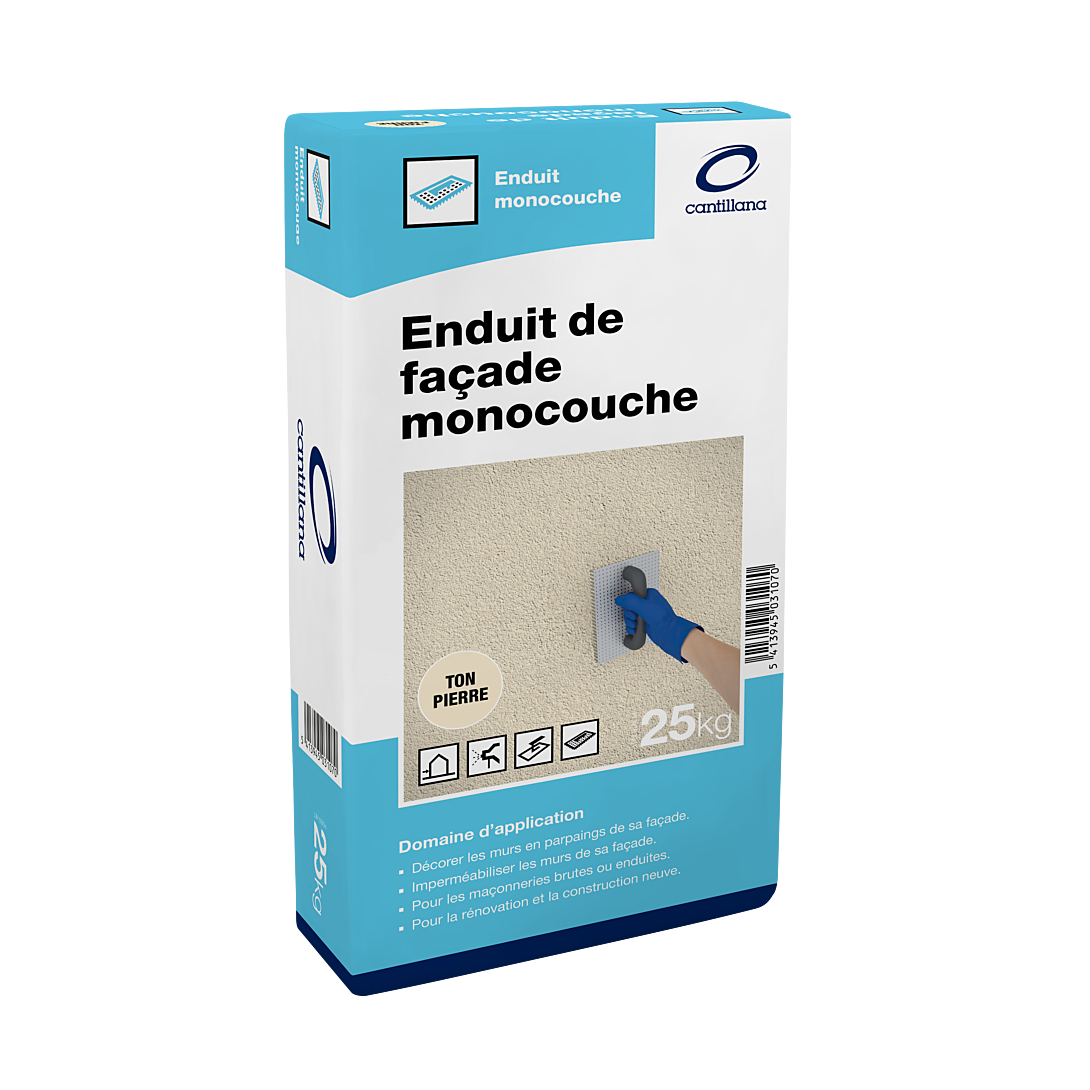 Enduit de façade monocouche sac 25 kg ton Pierre de type OC 3 destiné à l'imperméabilisation et décoration de murs en béton ou parpaings. Finitions écrasé, gratté ou rustique.