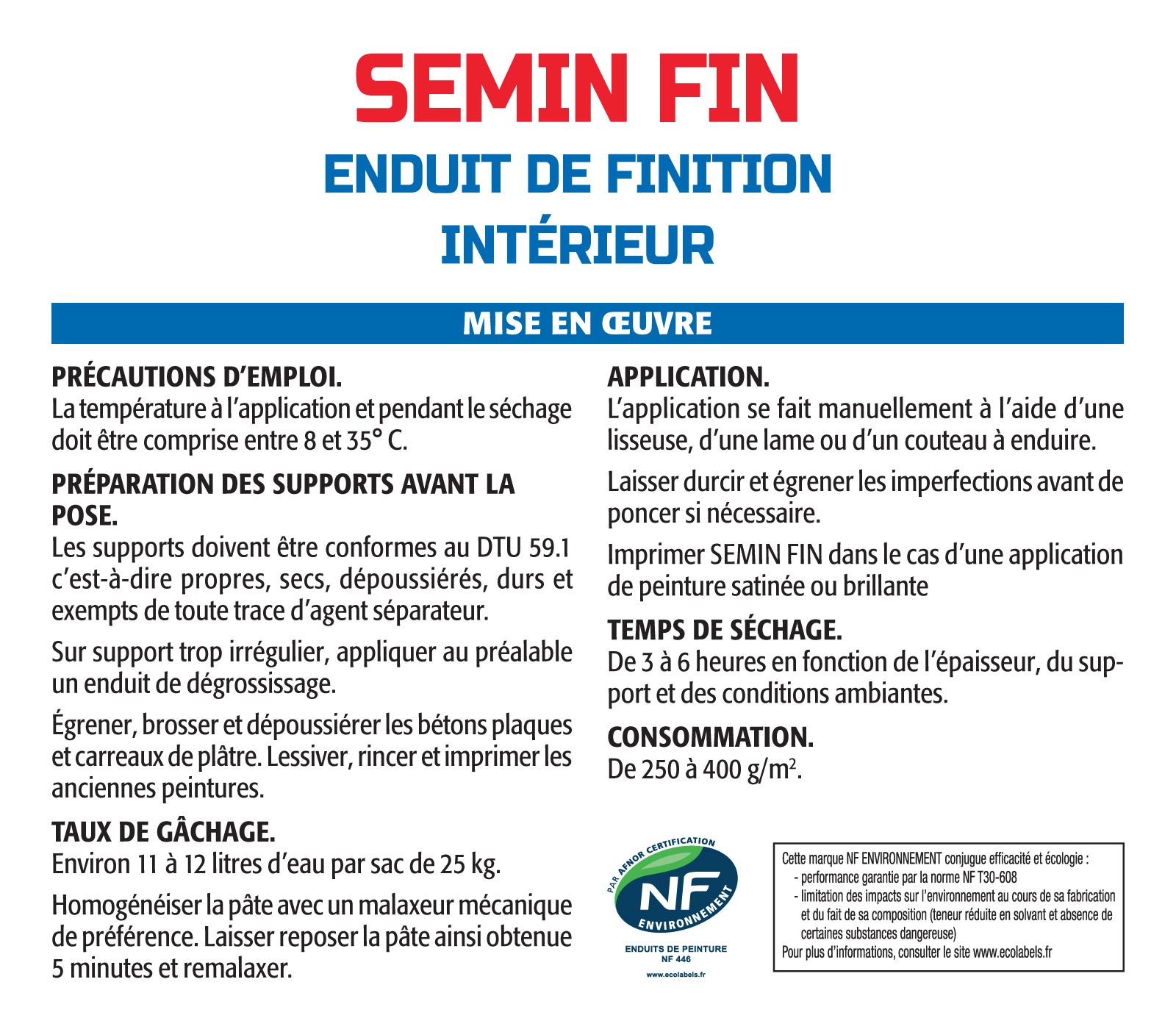 Libellé Enduit de Finition Semin F - Intérieur - Poudre - Sac de 25 kg