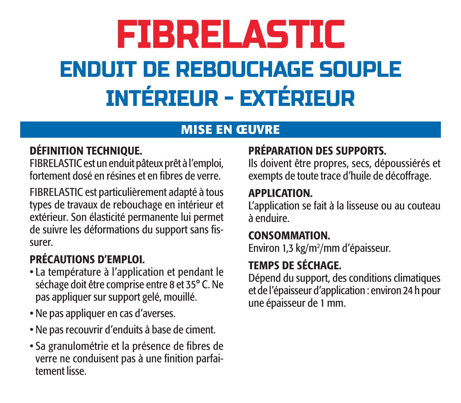Fibrelastic est un enduit pâteux prêt à l'emploi fortement dosé en résines et en fibres de verre, il est particulièrement adapté à tous types de travaux de rebouchage en intérieur et extérieur.