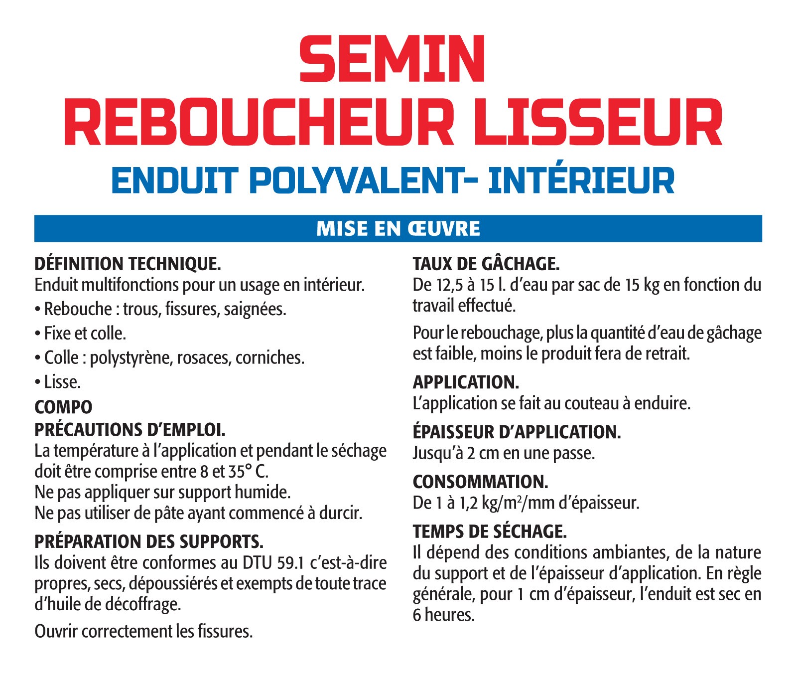 | Libellé | Enduit de Rebouchage et Lissage Semin (Françoise) - Intérieur - Poudre - sac 15 kg |