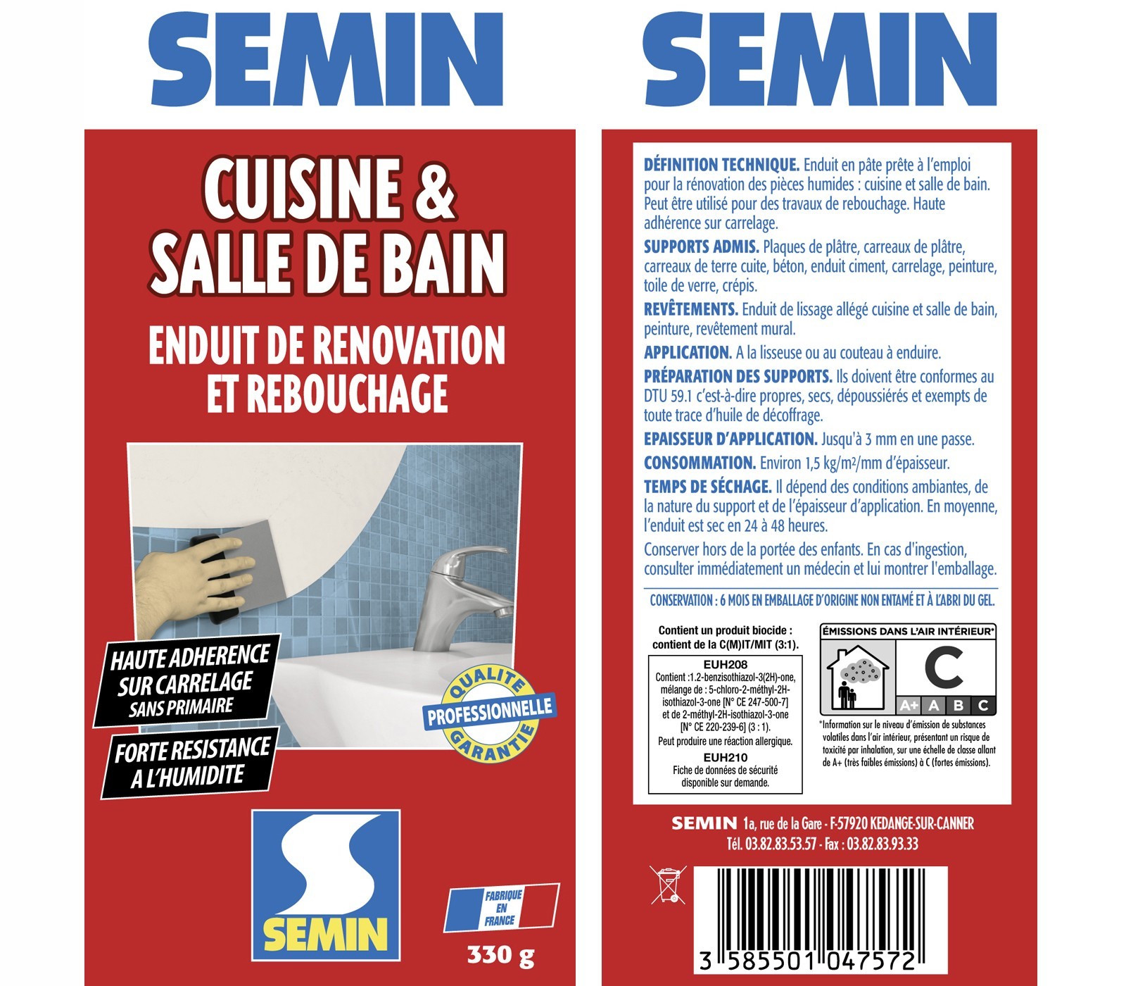 | Libellé | Enduit de rebouchage et rénovation spécial cuisine et salle de bain Semin - tube de 330 g |