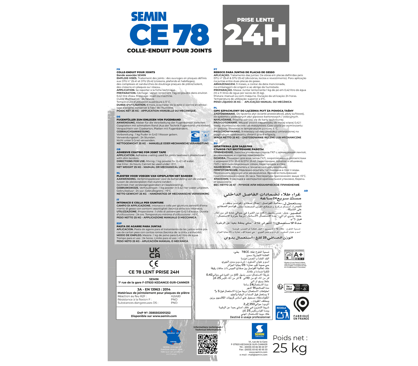 | Libellé | Enduit pour Joints de Plaques de Plâtre CE 78 Lent Semin - Temps de Prise 24 Heures - Intérieur -Sac de 25 kg (lot de 2) |