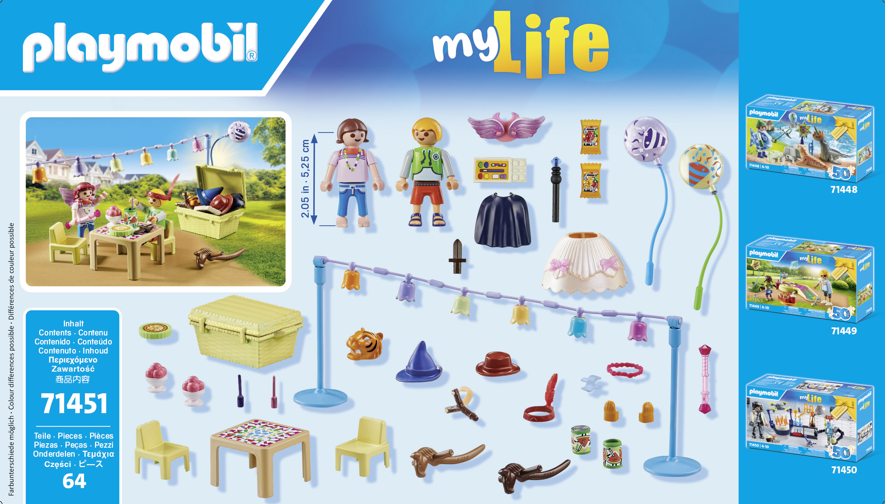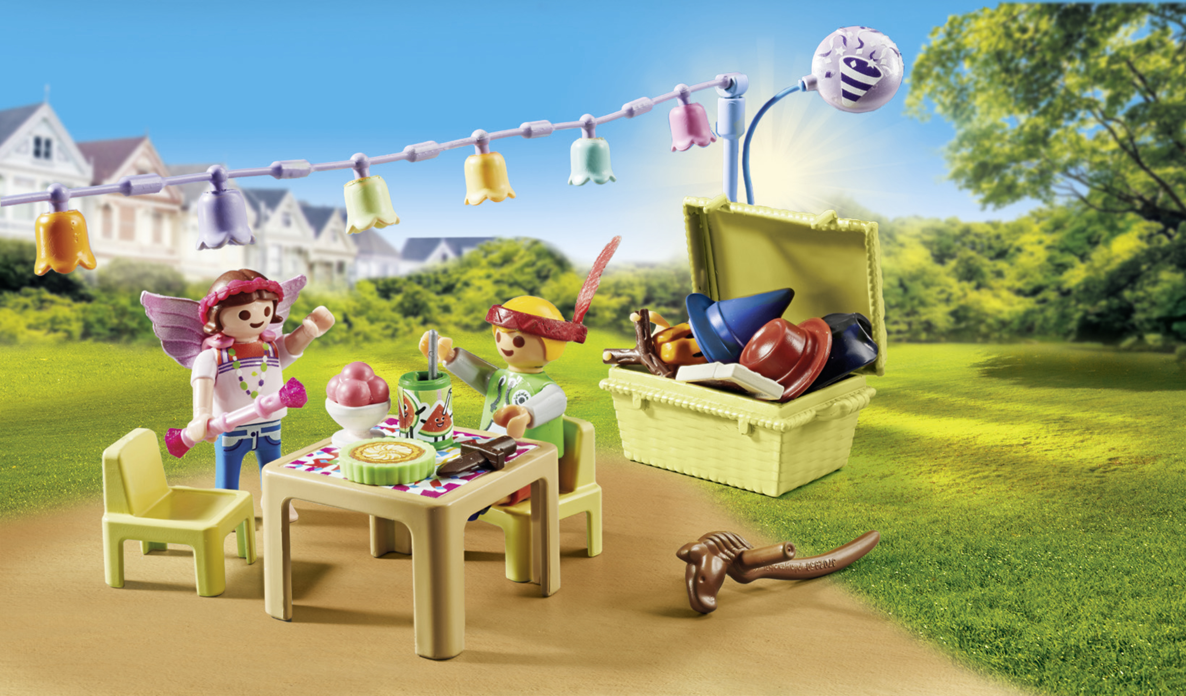 Préparez-vous à la fête costumée avec le tout nouveau coffret PLAYMOBIL "Enfants avec décorations de fête". Ce set comprend deux personnages PLAYMOBIL, des costumes, un panier, une table, de la nourriture et des accessoires. L'enfant qui fête son anniversaire vous invite à l'ultime fête costumée, et grâce aux nombreux costumes disponibles, les enfants peuvent endosser tous les rôles imaginables. Qu'il s'agisse d'un magicien avec un chapeau, une cape et une baguette, d'une princesse avec une jupe, un bandeau et un sceptre, d'un cow-boy avec un chapeau et un cheval de trait, ou d'un Indien avec un bandeau, une plume et un lance-pierre, les possibilités sont infinies. Il y a même un tigre avec un masque et des gants, et un ange avec un collier et des ailes. Et lorsque la faim se fait sentir, les petits invités peuvent s'asseoir à la table des enfants et se régaler de délicieuses glaces à la fraise, de gâteaux, de bonbons et de jus de fruits en canette. Le panier pliable permet de ranger les costumes et leurs accessoires.
