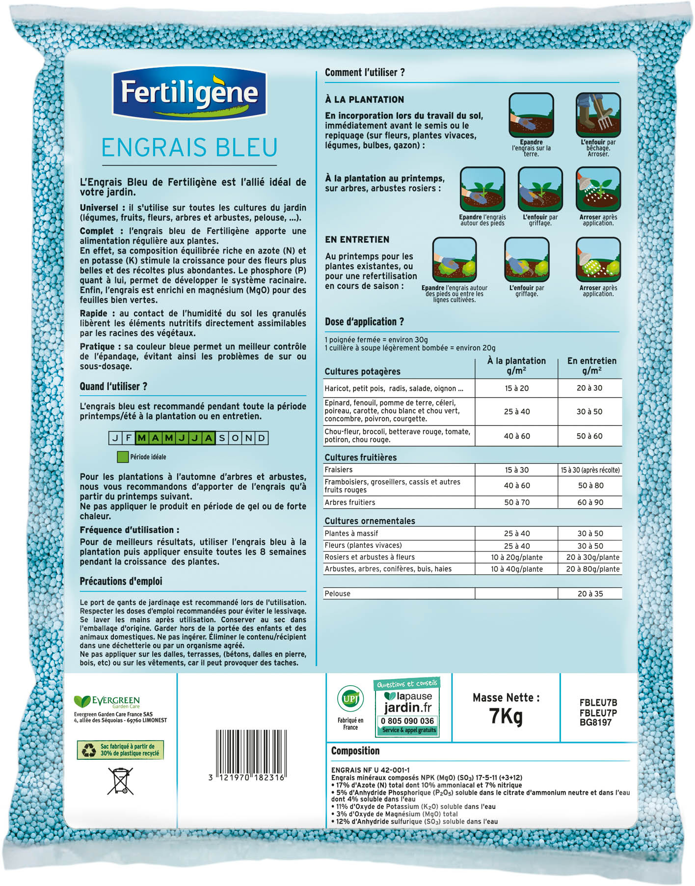 Grâce à sa formule complète avec magnésium, l’engrais bleu universel de Fertiligène est idéal pour favoriser la croissance de toutes les cultures du jardin (potagères, fruitières, ornementales). Polyvalent, il peut s’utiliser en fumure de fond ou en entretien. Pratique, sa couleur bleue permet un meilleur contrôle de l’épandage.