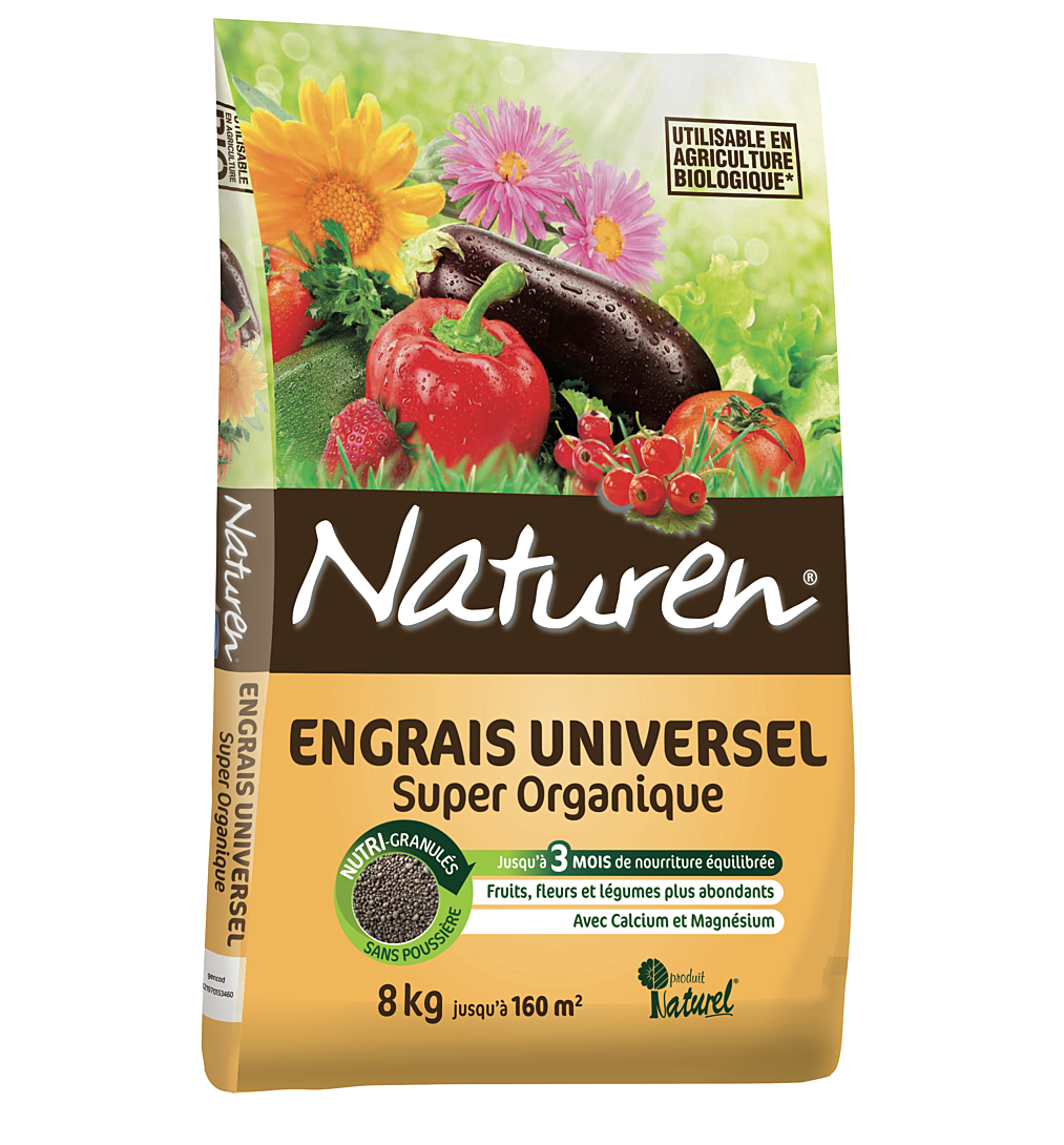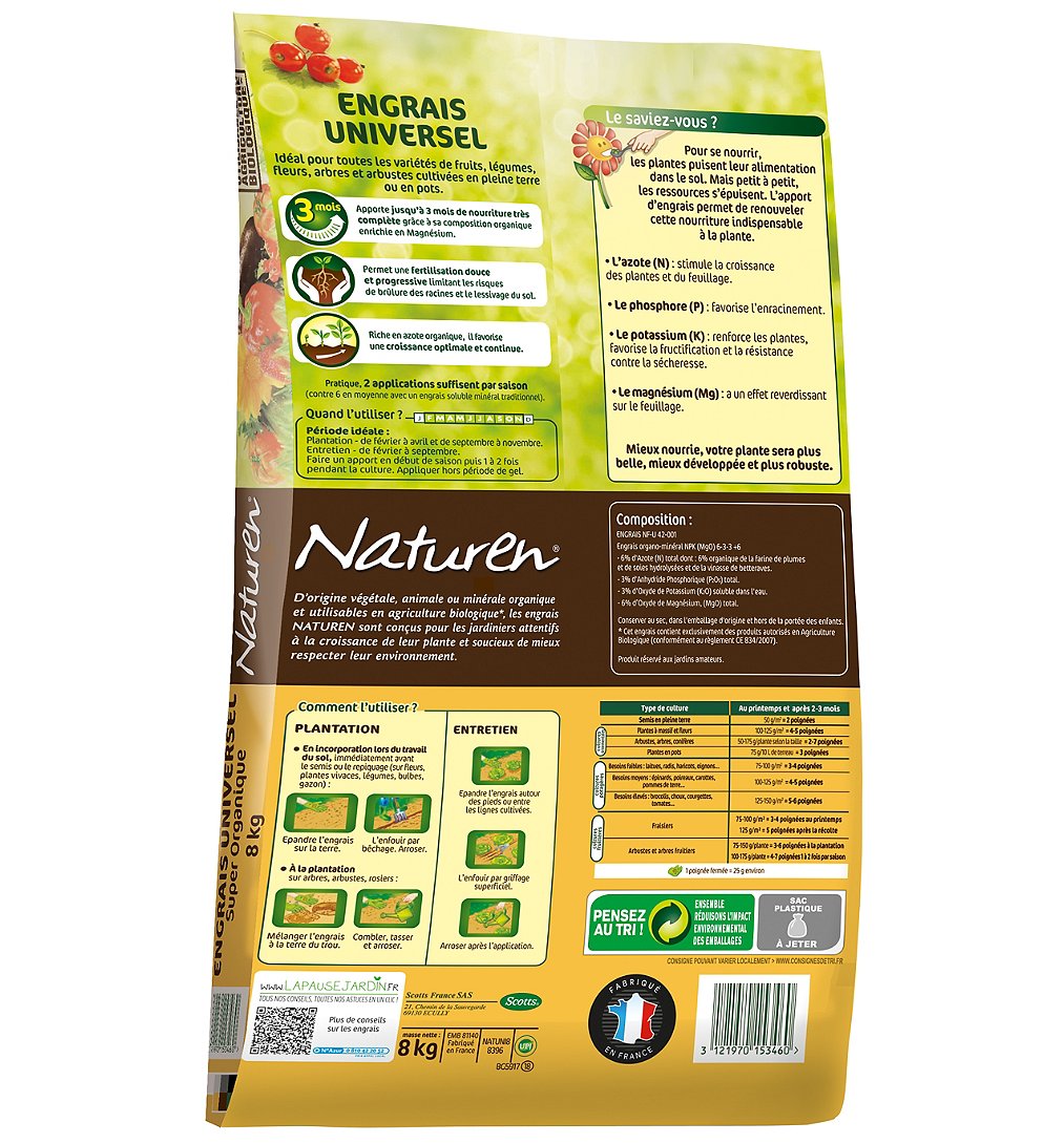 Naturen engrais universel 8kg, Engrais idéal pour toutes les variétés de fruits, légumes, fleurs, arbres et arbustes cultivées en pleine terre ou en pots, Apporte jusqu’à 3 mois de nourriture très complète grâce a sa composition organique enrichie en calcium et algues marines, Limite les risques de lessivage et nourrit de façon progressive, Utilisable en agriculture biologique*, Engrais nf u 42-001, Engrais organo-minéral NPK 6-3-3,