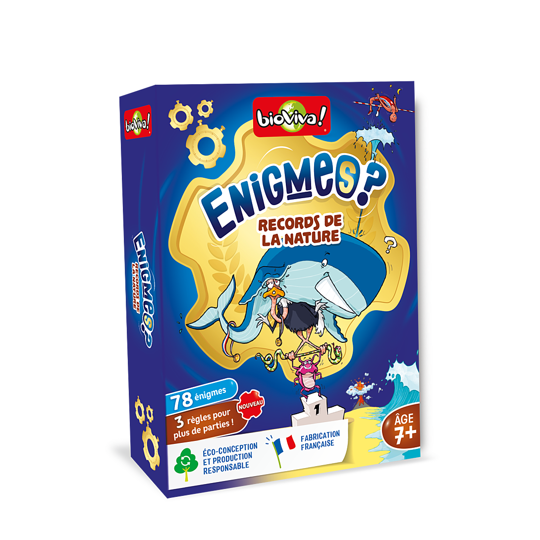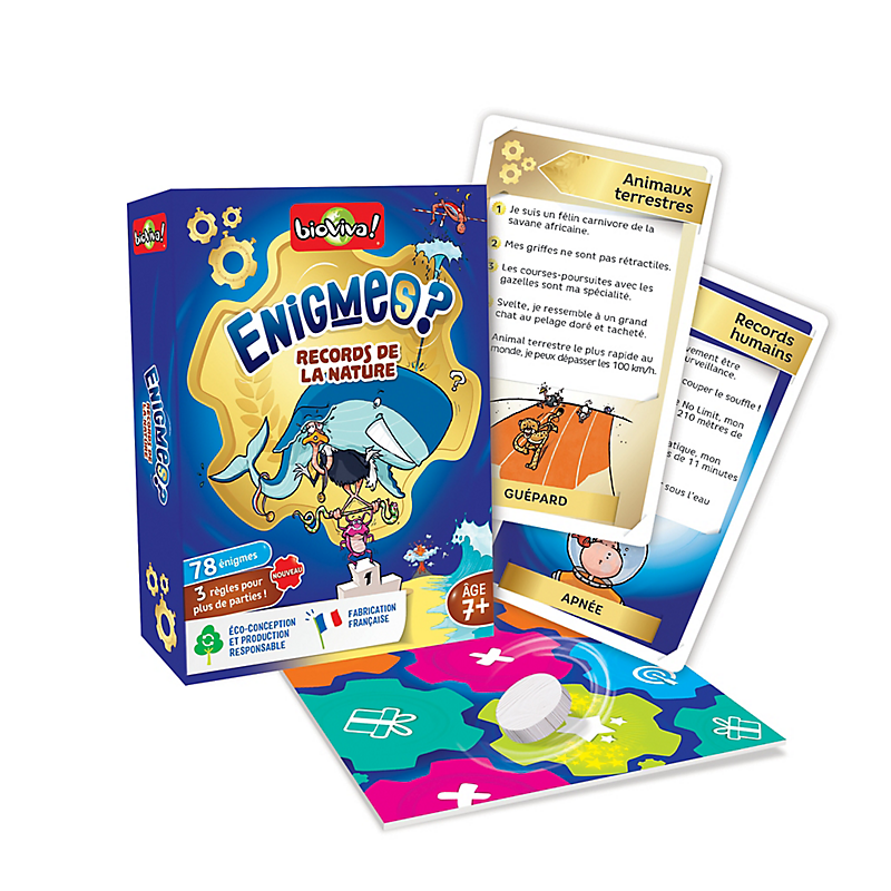 Serez-vous le plus rapide à deviner les records de la nature qui se cachent derrière les 5 indices ? Attention ! Il vous faudra aussi faire preuve d’adresse en lançant le jeton sur le plateau pour gagner (ou non) plus de cartes… De 2 à 6 joueurs. Dès 7 ans. Fabriqué en France de manière éco-responsable.