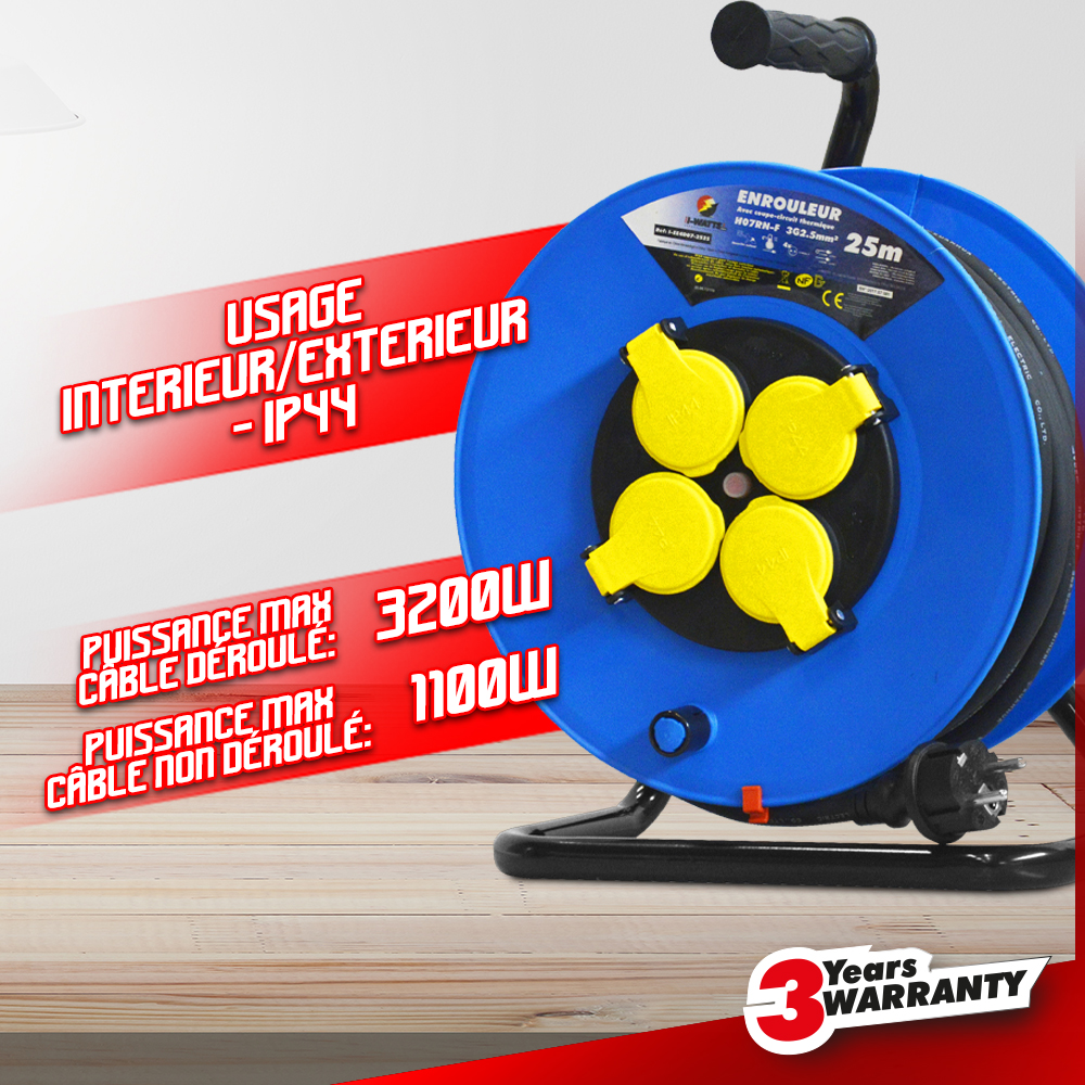 Cet enrouleur électrique de 25 mètres possède 4 prises à clapet et dispose d'une protection enfant. Il possède également un disjoncteur thermique qui protège l'enrouleur en cas de surchauffe. Maniable et léger, cet enrouleur I-Watts Pro dispose d'une poignée de transport ergonomique. Le câble s'enroule et se déroule facilement. Sa puissance max déroulé est de 3200 W.