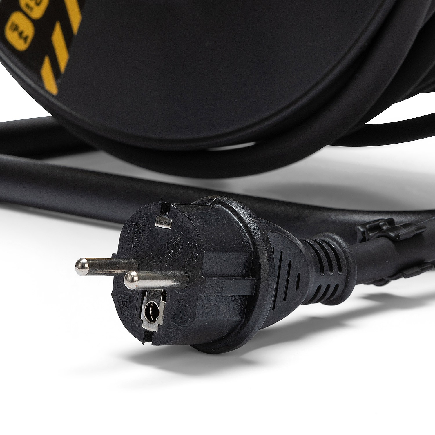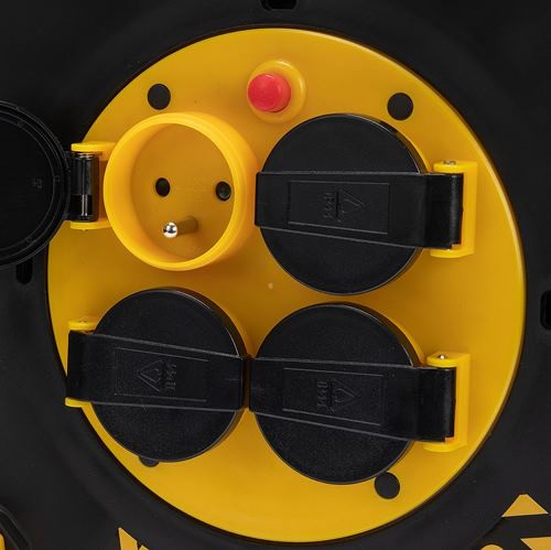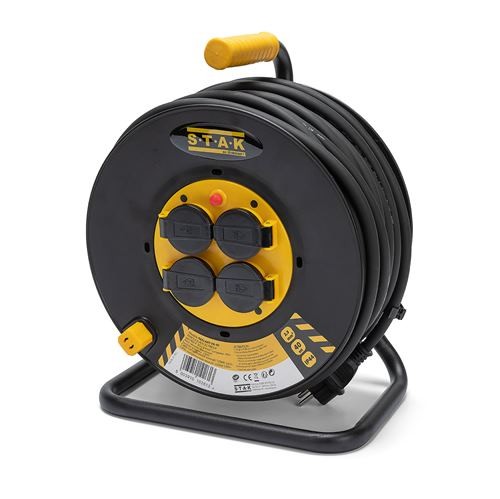 Enrouleur professionnel 4 prises IP44 (2P+T) - Poignée ergonomique et pratique pour gants de travail. Châssis acier hyper résistant. Water proof IP44 - idéal pour le jardin, le bricolage, les chantiers de construction ou les emplois professionnels . Câble 40m H07RN-F en néoprène 3G2.5 m. Avec disjoncteur thermique, bouton de rembobinage rotatif. Puissance max. enroulé: 1100W, déroulé: 3200W. Prises françaises: fiches et prises type E (CEE 7/7).
