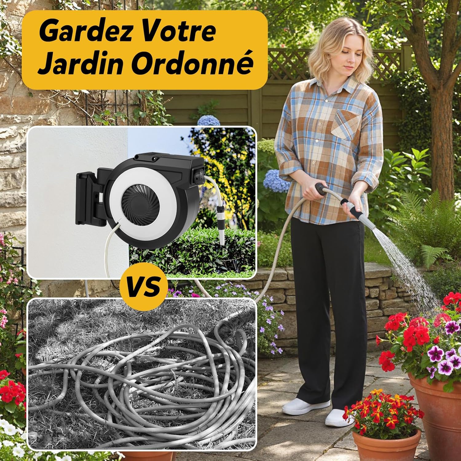 - Système d'enroulement automatique haute performance:Équipez-vous de notre enrouleur de tuyau qui intègre un mécanisme d'enroulement automatique avancé. Fini les tracas des tuyaux entortillés! Une simple traction et le tuyau se rétracte sans effort, permettant un rangement rapide et sécurisé qui facilite considérablement votre travail au jardin.