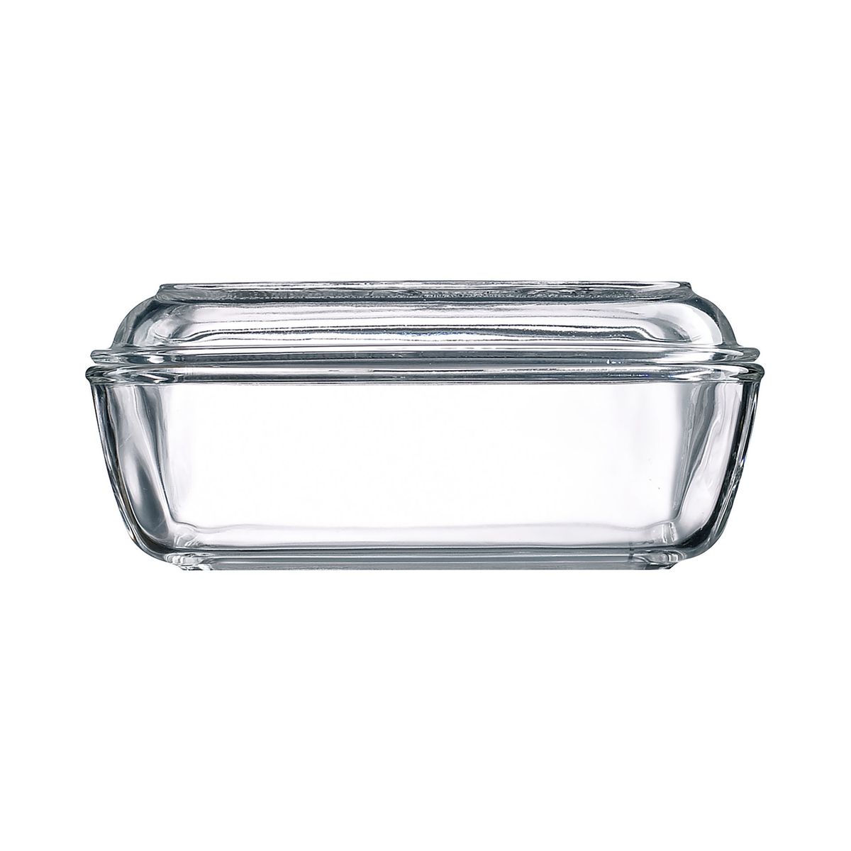 Beurrier en verre transparent de 17cm composé d'une base et d'un couvercle avec une vache imprimée dans le verre