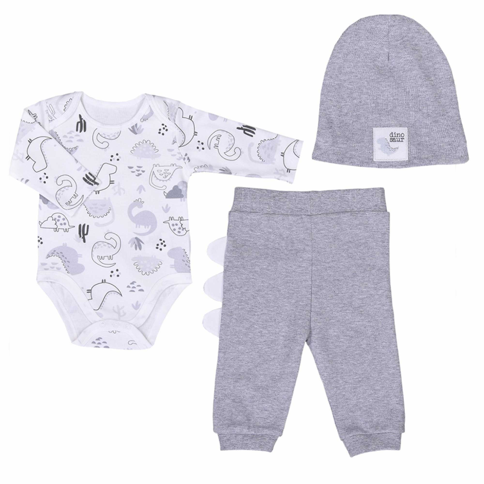 L'adorable ensemble de vêtements Bébé "Dino" comprend un body à manches longues à imprimés dinosaures, un bonnet et un joli pantalon. Confectionnés en coton biologique, cet ensemble de vêtements bébé vous garantit le respect de la peau fragile de votre enfant.