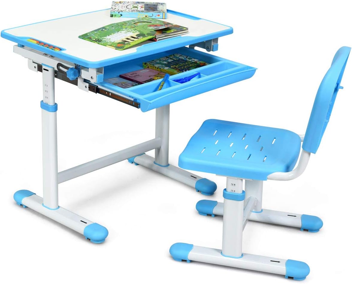 Ensemble bureau et chaise pour enfant avec hauteur réglable et table inclinable, avec tiroir et crochet s