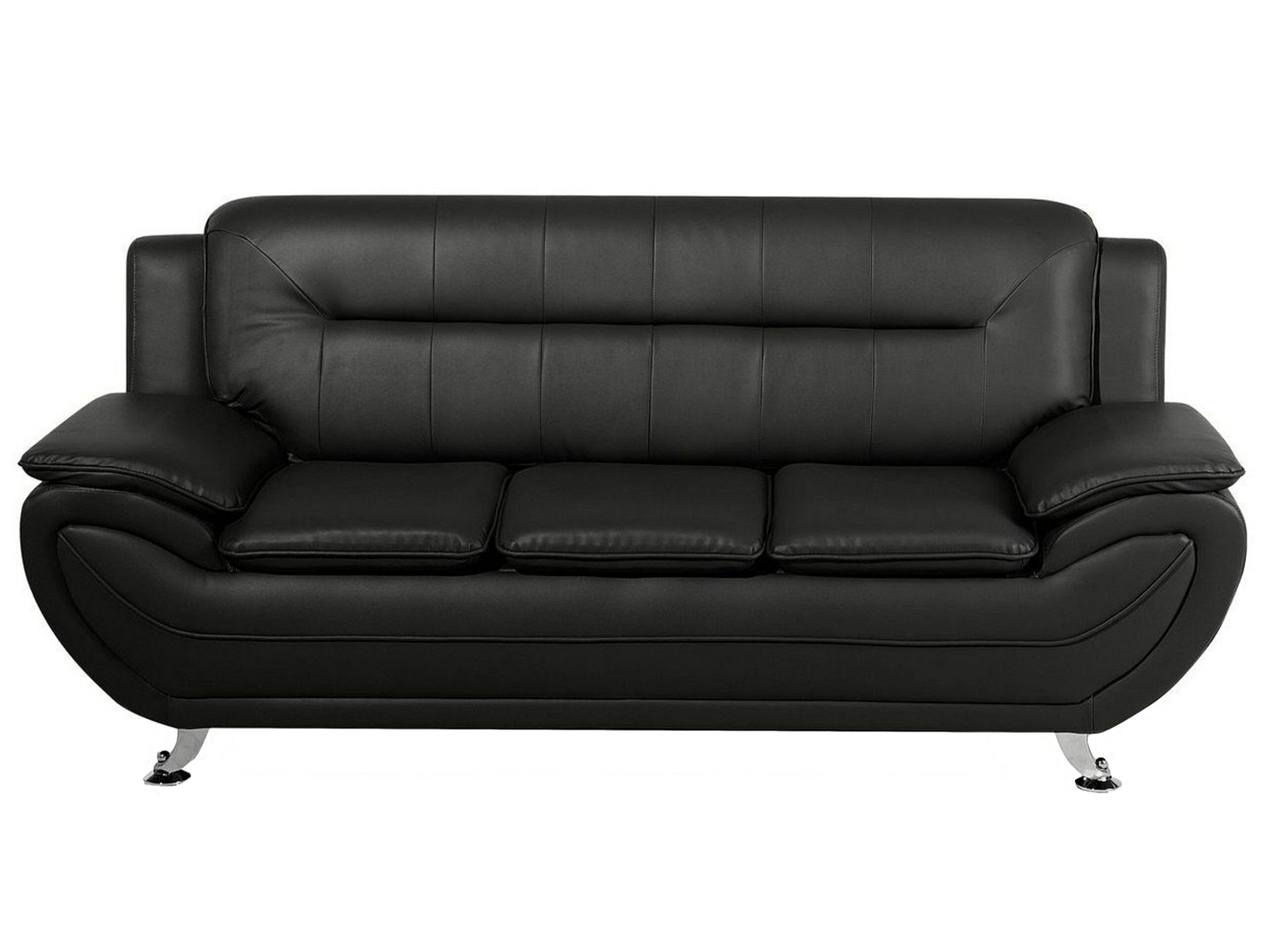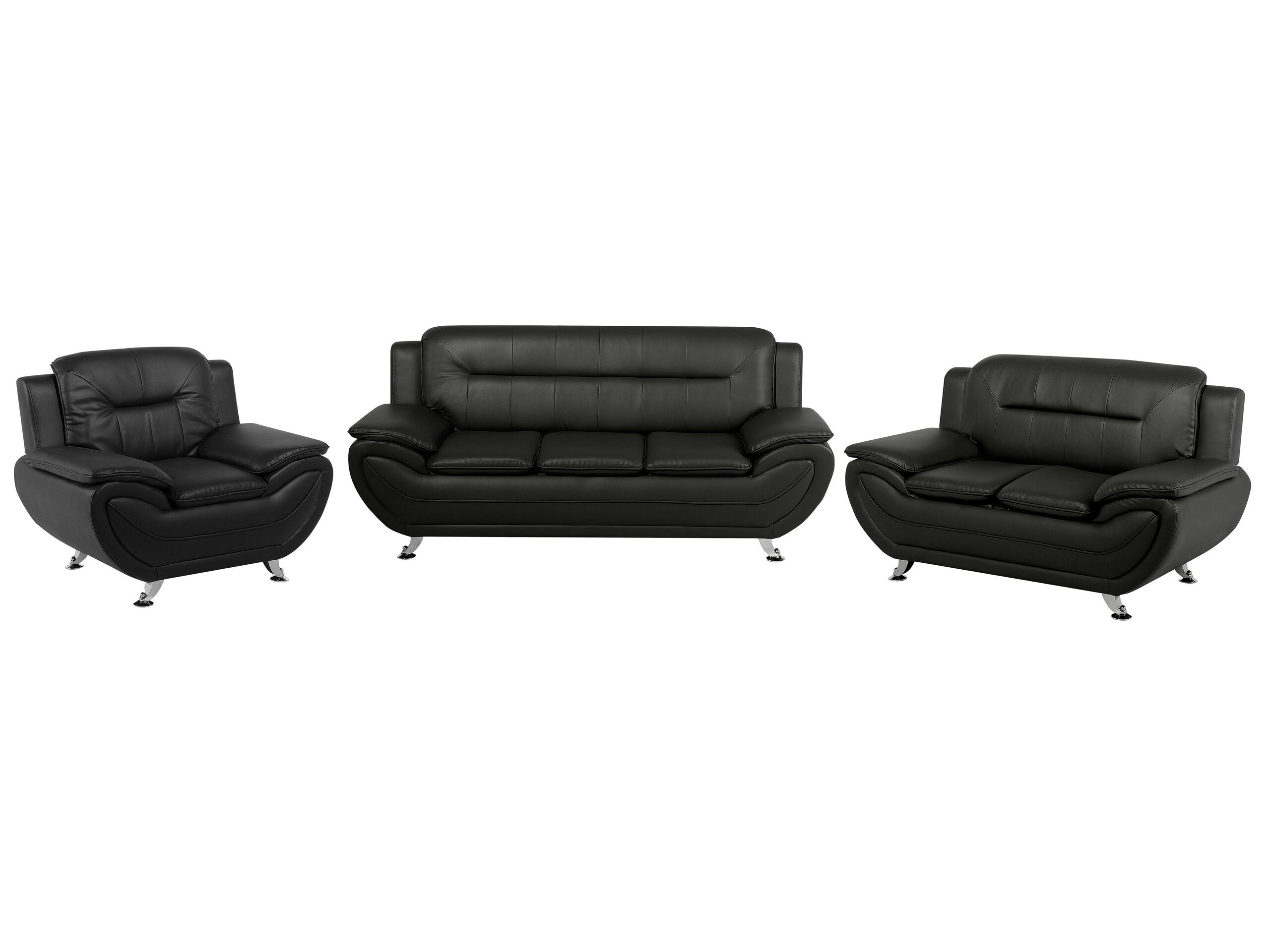 Canapé 3 et 2 places et fauteuil. Confort et modernité - cet ensemble de canapés et fauteuil vous offre à la fois une assise profonde et moelleuse et un look accrocheur. On adore la forme incurvée de ce mobilier, les accoudoirs extrêmement larges et les coutures décoratives. Composé d'un canapé 3 places, d'un canapé 2 places et d'un fauteuil de la même collection, le magnifique salon peut accueillir jusqu'à 6 personnes. Revêtu en cuir PU noir résistant à l'usure, ce mobilier ultra élégant repose sur des pieds en métal argenté brillant - un choix idéal pour votre espace de détente préféré.