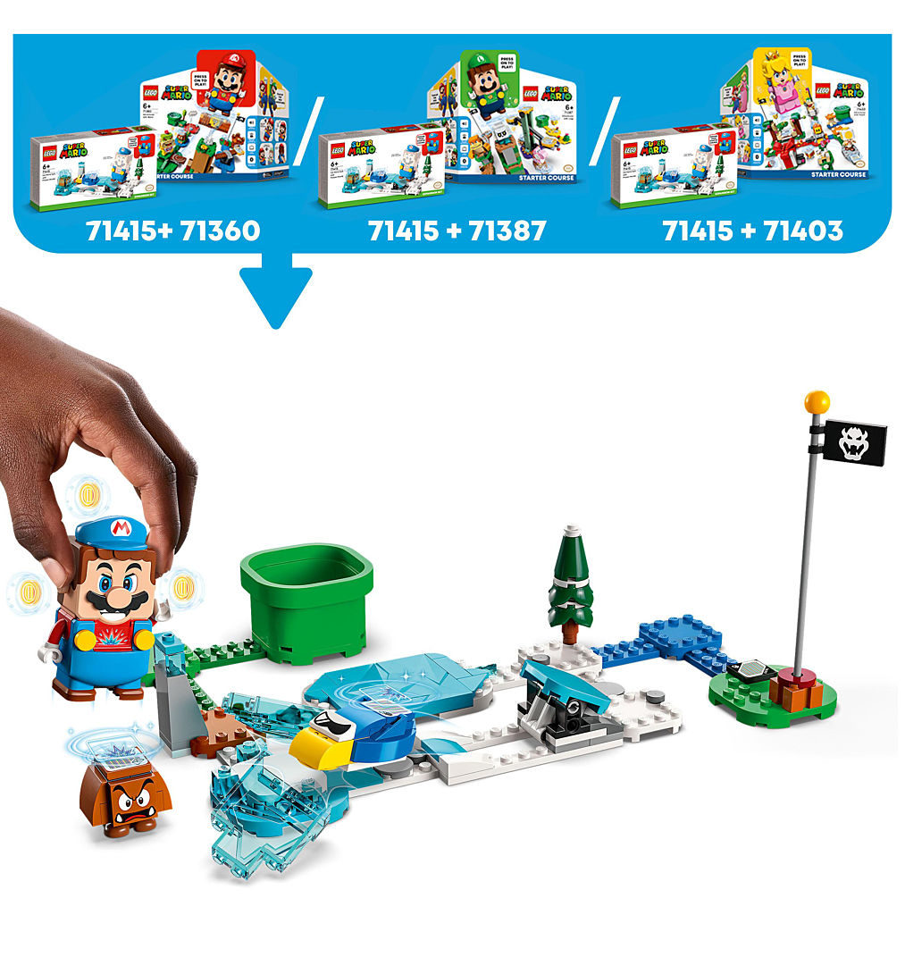 Les enfants peuvent construire un niveau glacé LEGO® Super Mario™ avec l’Ensemble d'extension Costume de Mario de glace et monde glacé (71415), qui inclut un costume de Mario de glace pour le personnage LEGO® Mario™ (non inclus) ainsi qu’un Pinglisse et un Goomba LEGO. Lorsque LEGO Mario « patine » sur la plaque de glace bleue, il émet des sons de patins. Le set inclut également un lanceur qui permet d’envoyer le Pinglisse dans un bloc de glace en briques. Lorsque le bloc se brise, le Goomba apparaît (remarque : un Pack de démarrage 71360, 71387 ou 71403 est requis pour jouer). Jeux créatifs à partager Ce set à collectionner est parfait pour les enfants de 6 ans et plus qui n’ont pas froid aux yeux. Il est idéal pour jouer seul ou à plusieurs. Retrouvez les instructions et plus encore dans l’appli LEGO Super Mario. Créativité illimitée Avec les Packs de démarrage et les Ensembles d’extension LEGO Super Mario, les fans agrandissent, transforment et personnalisent leurs propres niveaux.