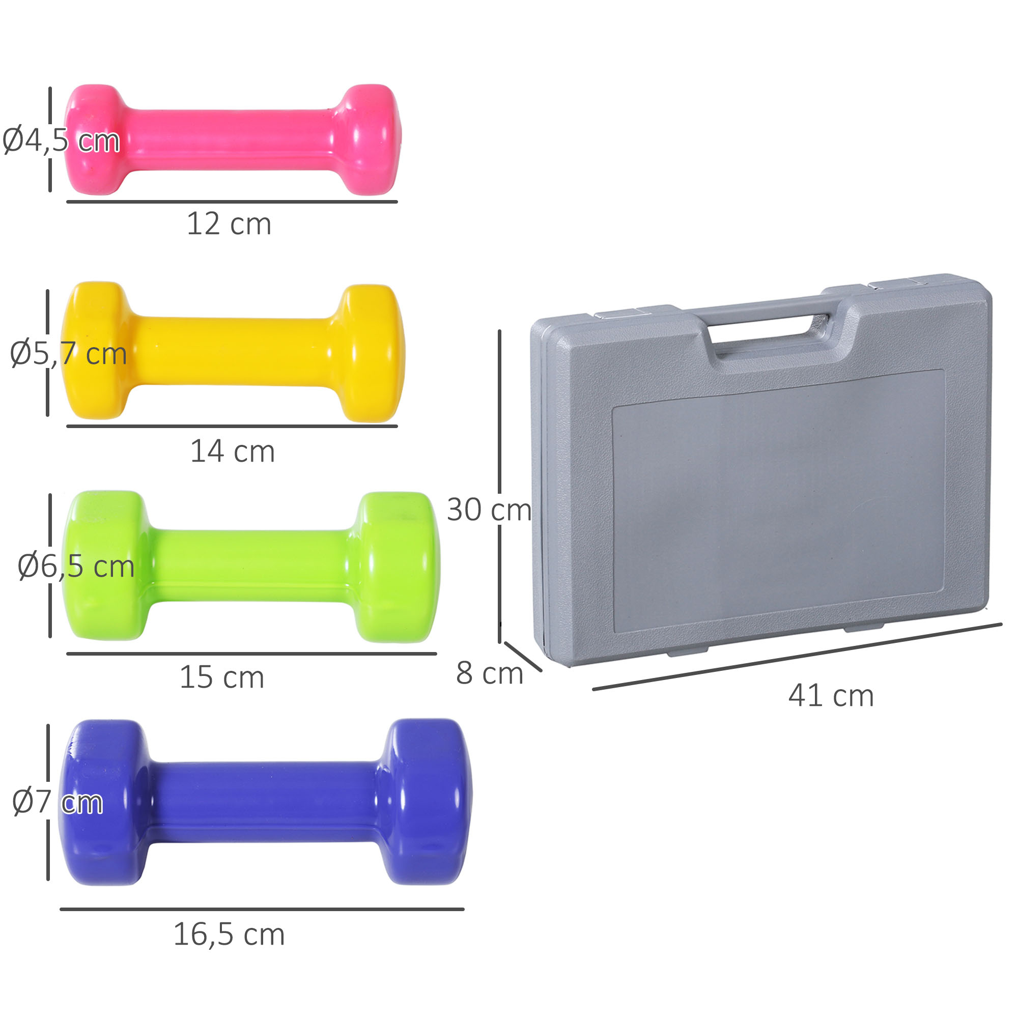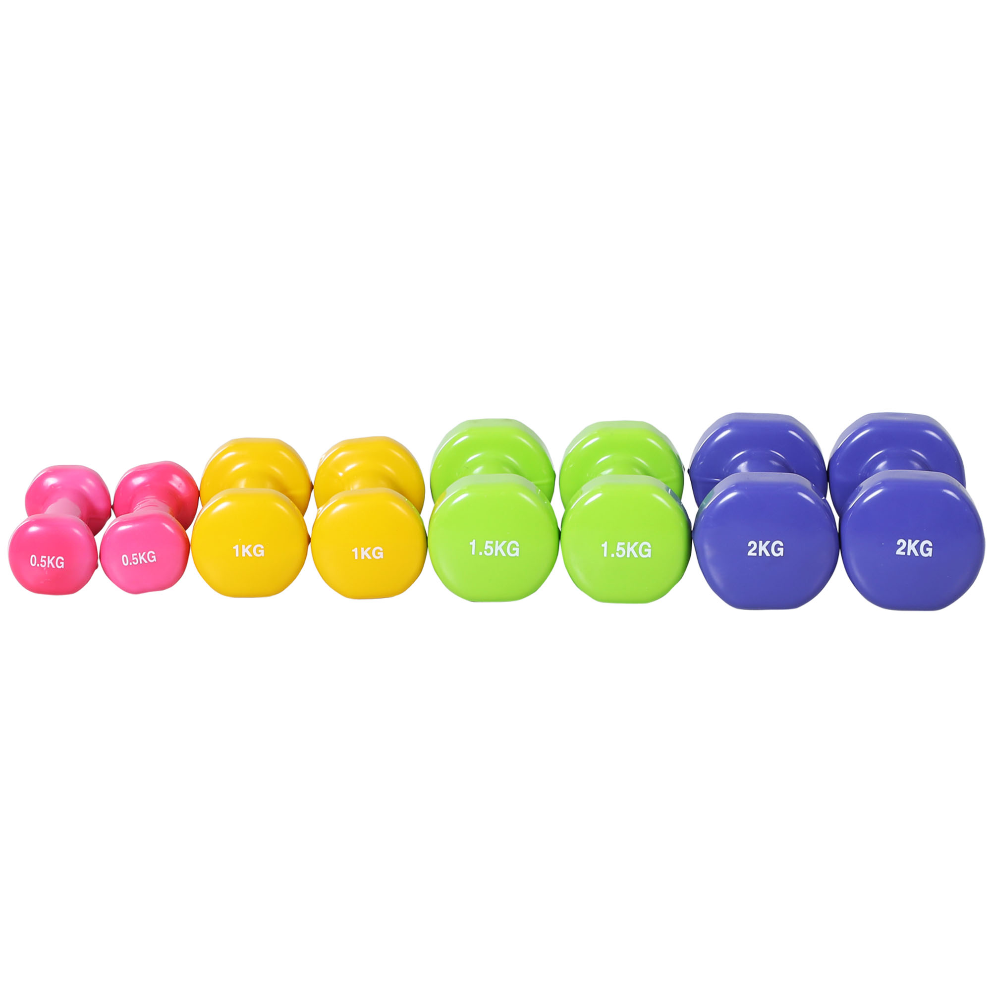 - Ensemble de 8 pièces composé de 2 haltères de 0,5 Kg, 2 haltères de 1 Kg, 2 haltères de 1,5 Kg, 2 haltères de 2 Kg