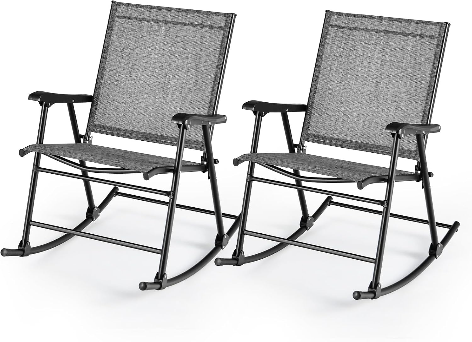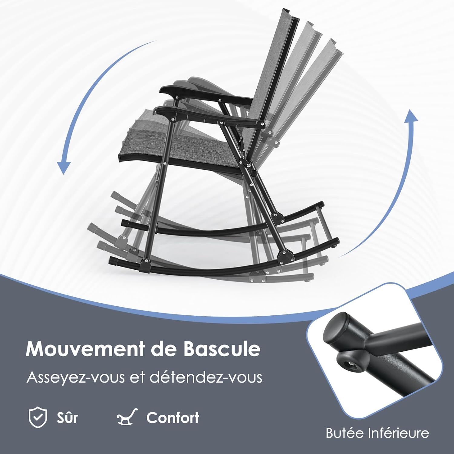 Cet ensemble de 2 chaises à bascule est construit avec une structure en métal solide et un tissu de qualité. Le loquet de sécurité verrouille la bascule tandis que le mouvement fluide vous permet de vous balancer doucement. Le design ergonomique, le dossier haut et les accoudoirs vous offriront le confort. Que ce soit pour lire, prendre un verre ou vous détendre, cet ensemble fera un merveilleux ajout à votre espace extérieur. Aucun assemblage requis et elles sont faciles à utiliser. Ces chaises à bascule légères sont également pliables pour les emporter au camping ou en voyage.