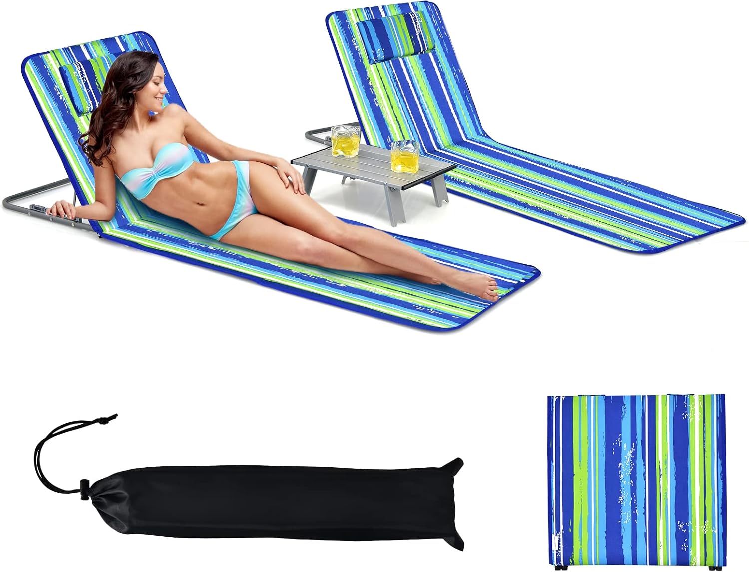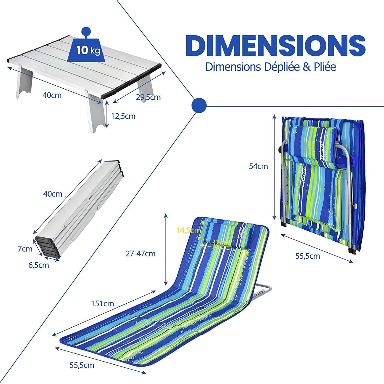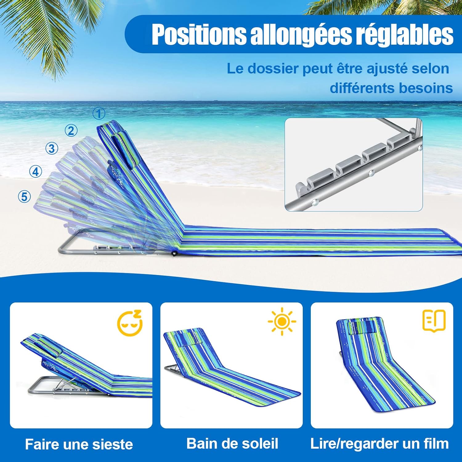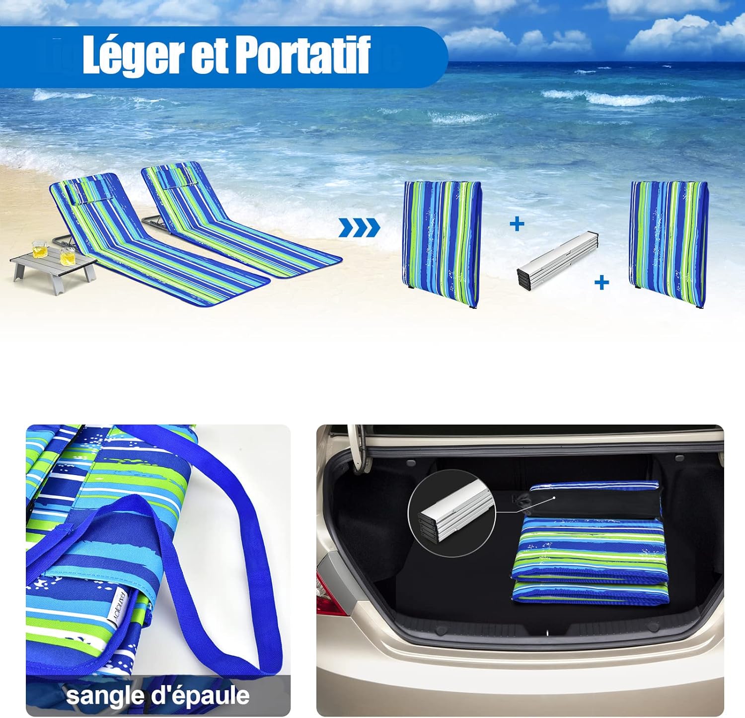 - Chaise de Plage Confortable : Cet ensemble de tapis de plage est doté de cinq niveaux de réglage, 47/44,5/41/35/27 cm, ce qui vous permet d'adapter la hauteur à vos besoins et de détendre les muscles de votre dos. Deux appuis-tête souples sont également inclus pour vous permettre de bien vous reposer.