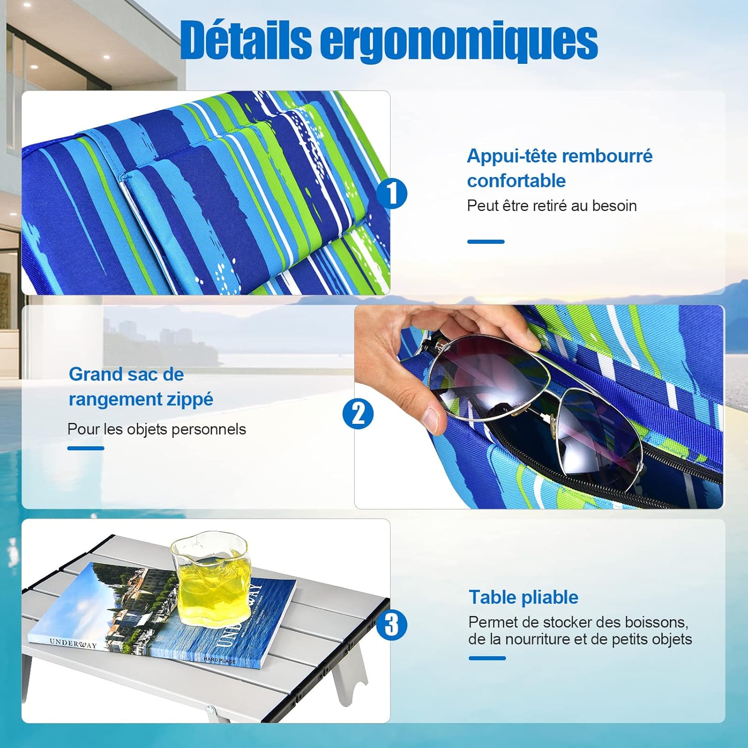 | Libellé | Ensemble de 2 chaises de plage à 5 positions et table basse, 2 chaises de plage avec appuie-têtes |