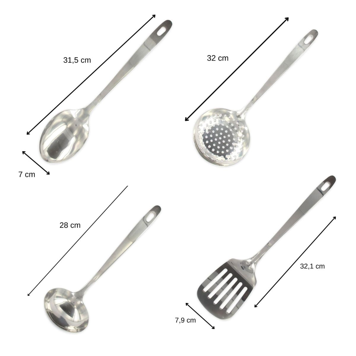 | Dimensions (cm) | La pelle ajourée mesure 32,1 x 7,9 x 3 cm, la louche de cuisine mesure 28 x 8,8 cm, l'écumoire mesure 32 x 11 cm, la cuillère de service mesure 31,5 x 7 cm |