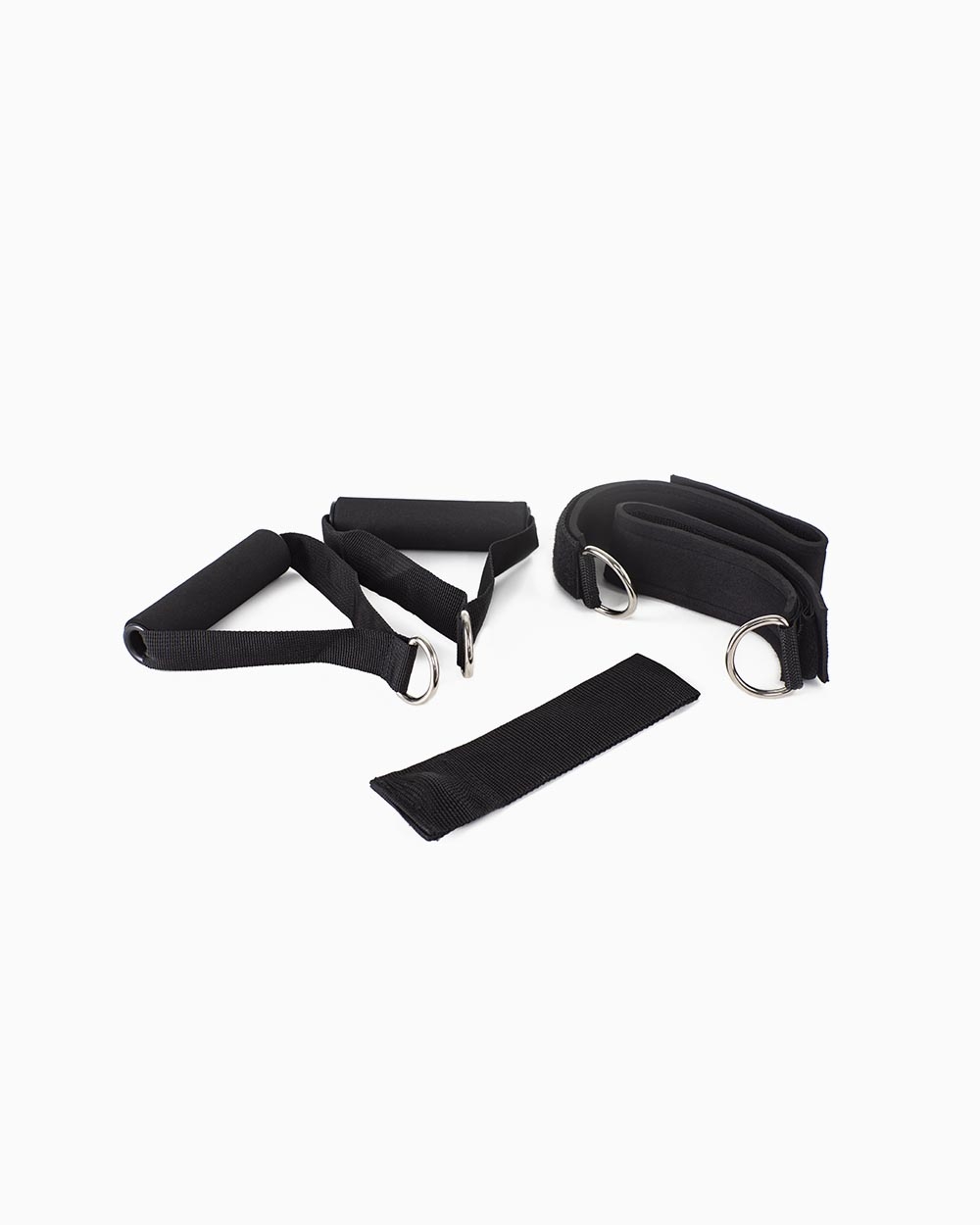 - L'ensemble est également livré avec 2 poignées, 2 bandes velcro qui permettent d'attacher les élastiques à un objet fixe et une pièce à attacher à la porte.