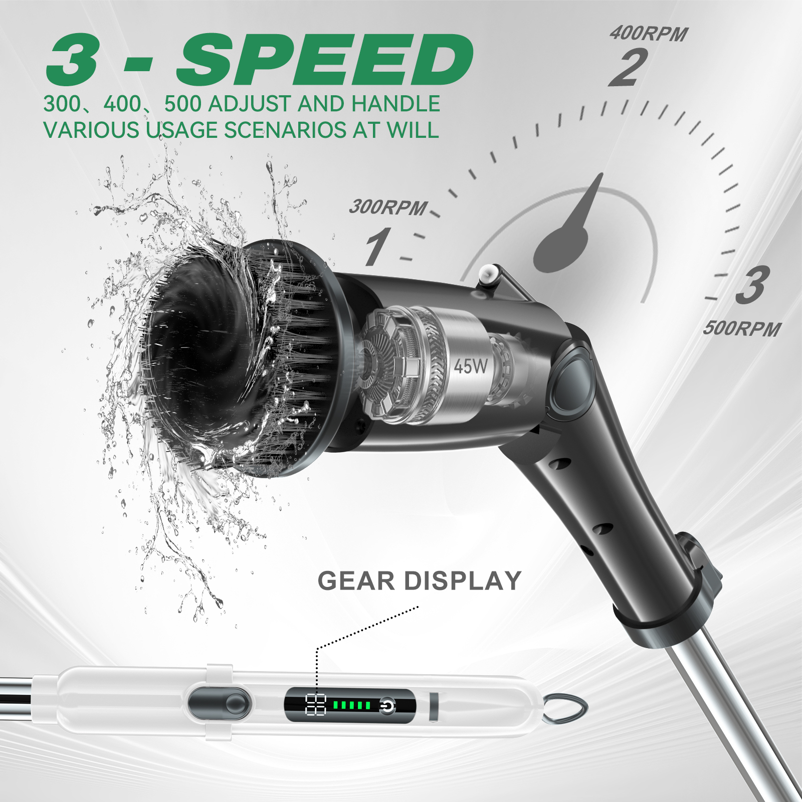 Nettoyage puissant : La brosse de nettoyage électrique dispose d'un moteur puissant avec trois vitesses réglables, offrant 230, 310 et 390 rotations par minute. Cela vous permet d’effectuer facilement diverses tâches de nettoyage, du récurage léger au nettoyage intensif.