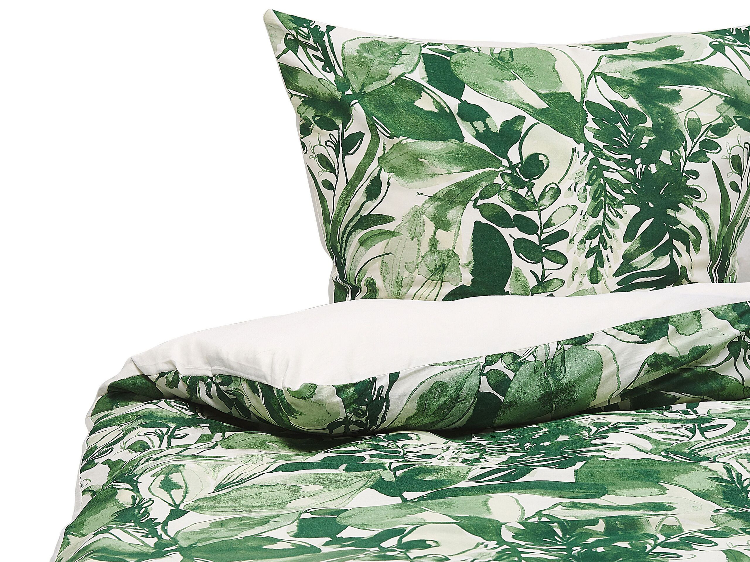 Set housse de couette et taies d'oreiller vert et blanc. Rafraîchissez le look de votre chambre avec cet ensemble de linge de lit à motif naturel. La couleur blanche et verte ainsi que le motif feuillage inspiré de la nature de cet ensemble sera un ajout idéal dans une chambre de style boho possédant des éléments en rotin ou en bois. Cette housse de couette et ces 2 taies d'oreiller sont en coton doux et satiné et apporteront un grand confort à votre lit.