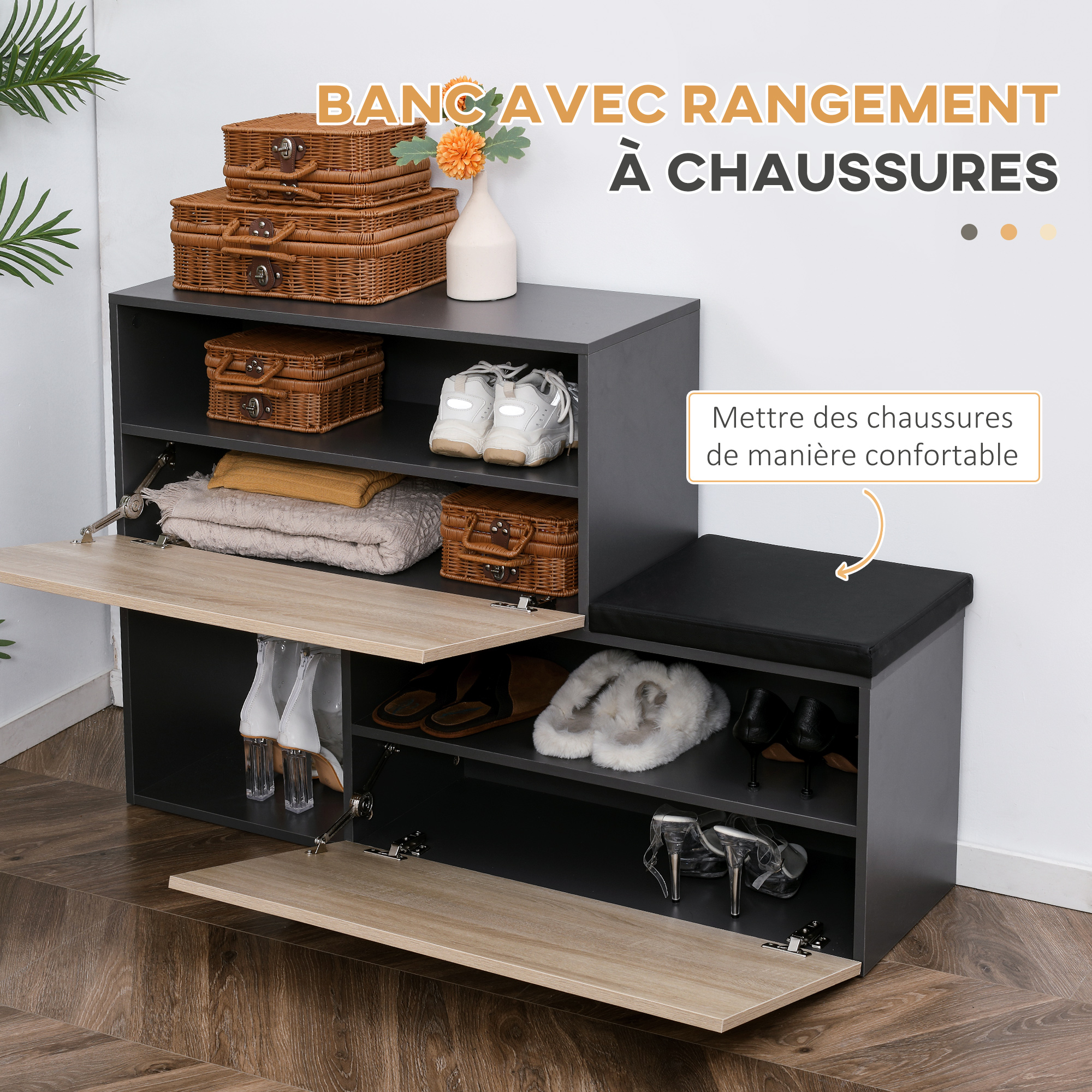 - Le banc avec meuble de rangement offre un espace de rangement supplémentaire pour vos articles personnels et vos chaussures
