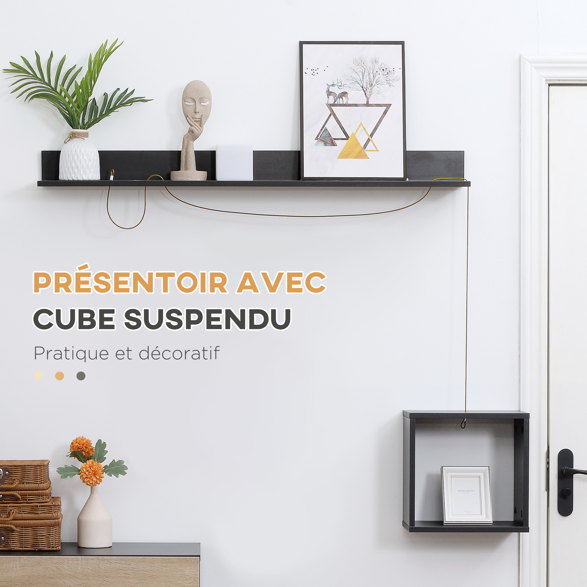 - L'étagère supérieure et le cube suspendu sont utilisés pour le rangement des objets de déco