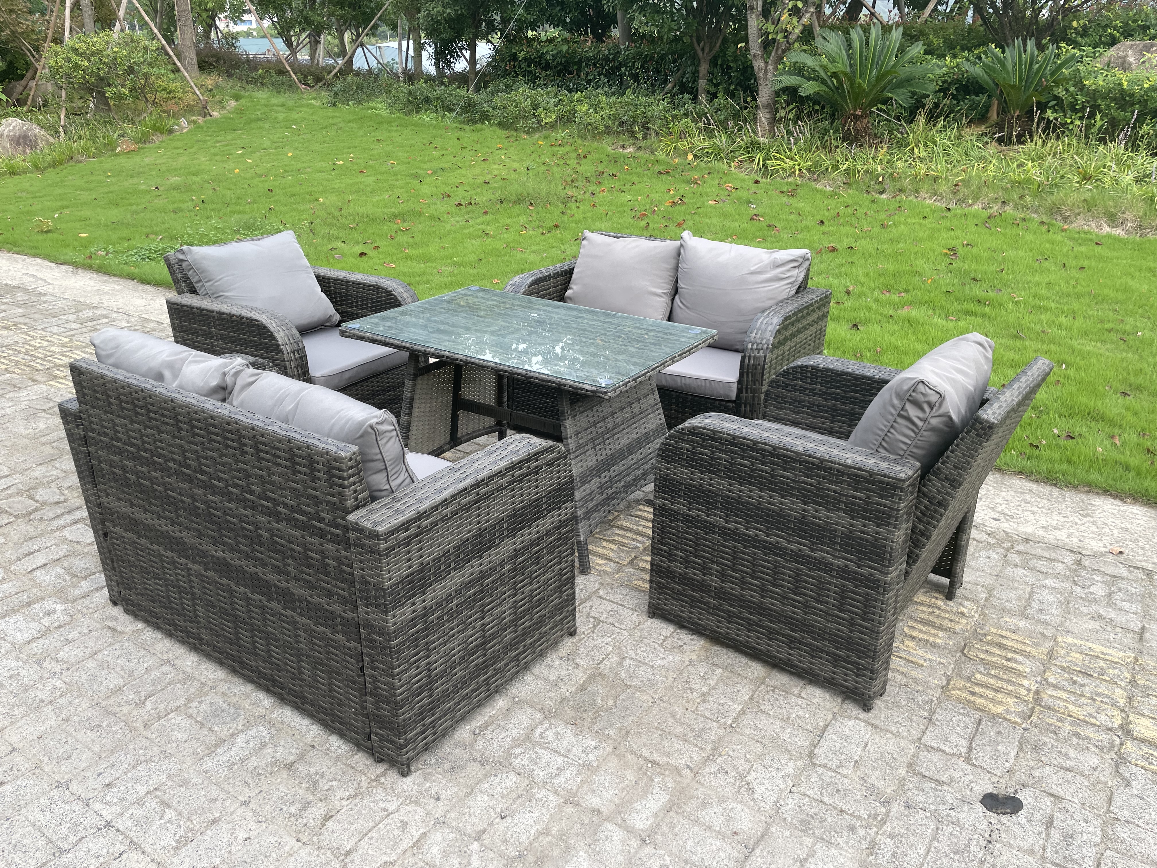 | Libellé | Ensemble de meubles de jardin en polyrotin Table à manger Chaise inclinables Canapé d'amour 6 places |