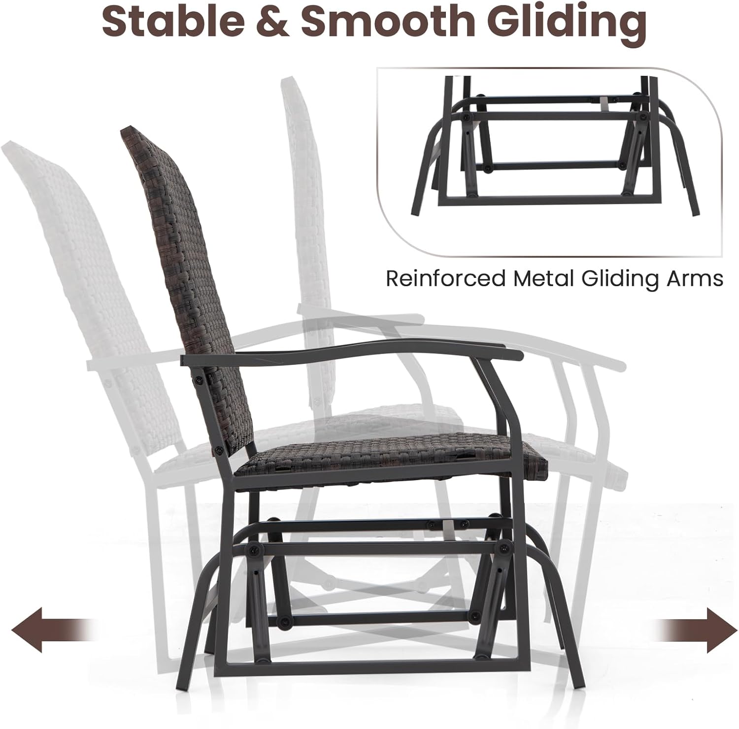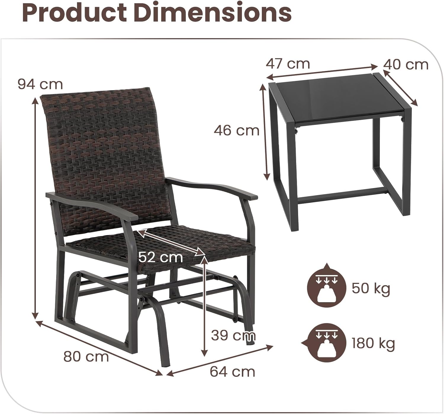 - Mécanisme à bascule doux : profitez de la tranquillité et de la détente dans votre jardin avec notre ensemble de chaises à bascule de jardin. Les bras coulissants lisses et renforcés des chaises permettent un mouvement de balancement doux et apaisant et en font le choix idéal pour se reposer après une journée bien remplie.