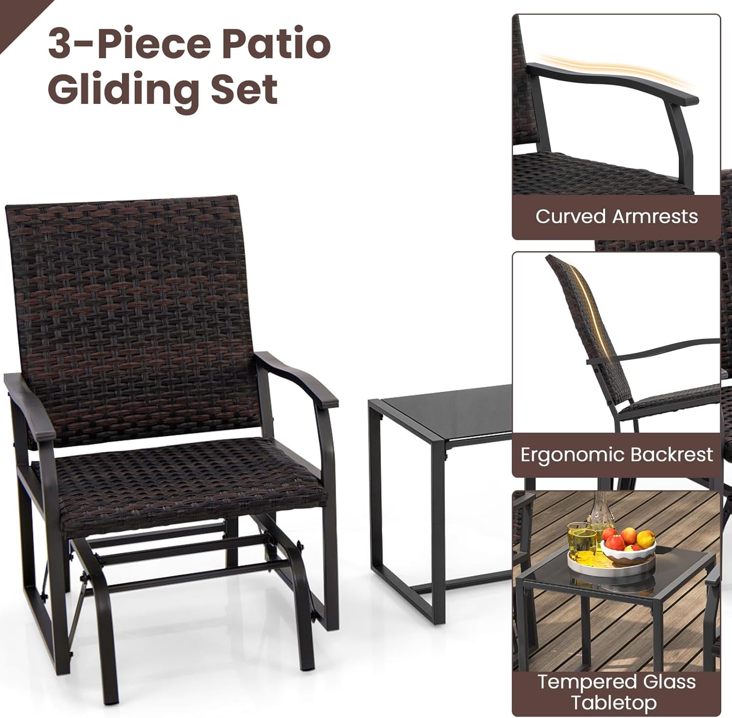 Profitez de la tranquillité et de la détente dans votre jardin avec notre ensemble de chaises à bascule de jardin. Fabriqué en rotin PE de haute qualité, cet ensemble de meubles de jardin est extrêmement résistant aux UV, à la décoloration et imperméable, offrant une excellente respirabilité et un toucher agréable. Les fauteuils à bascule sont remplis de mousse à séchage rapide, ce qui offre une sensation d'assise douce. Une table d'appoint pratique avec plateau en verre trempé offre suffisamment d'espace pour vos affaires quotidiennes. Les repose-pieds réglables assurent un maintien stable sur n'importe quelle surface. Cet élégant ensemble de meubles de terrasse est un complément polyvalent à votre jardin, balcon ou terrasse. Ne manquez pas l'occasion de l'introduire chez vous !