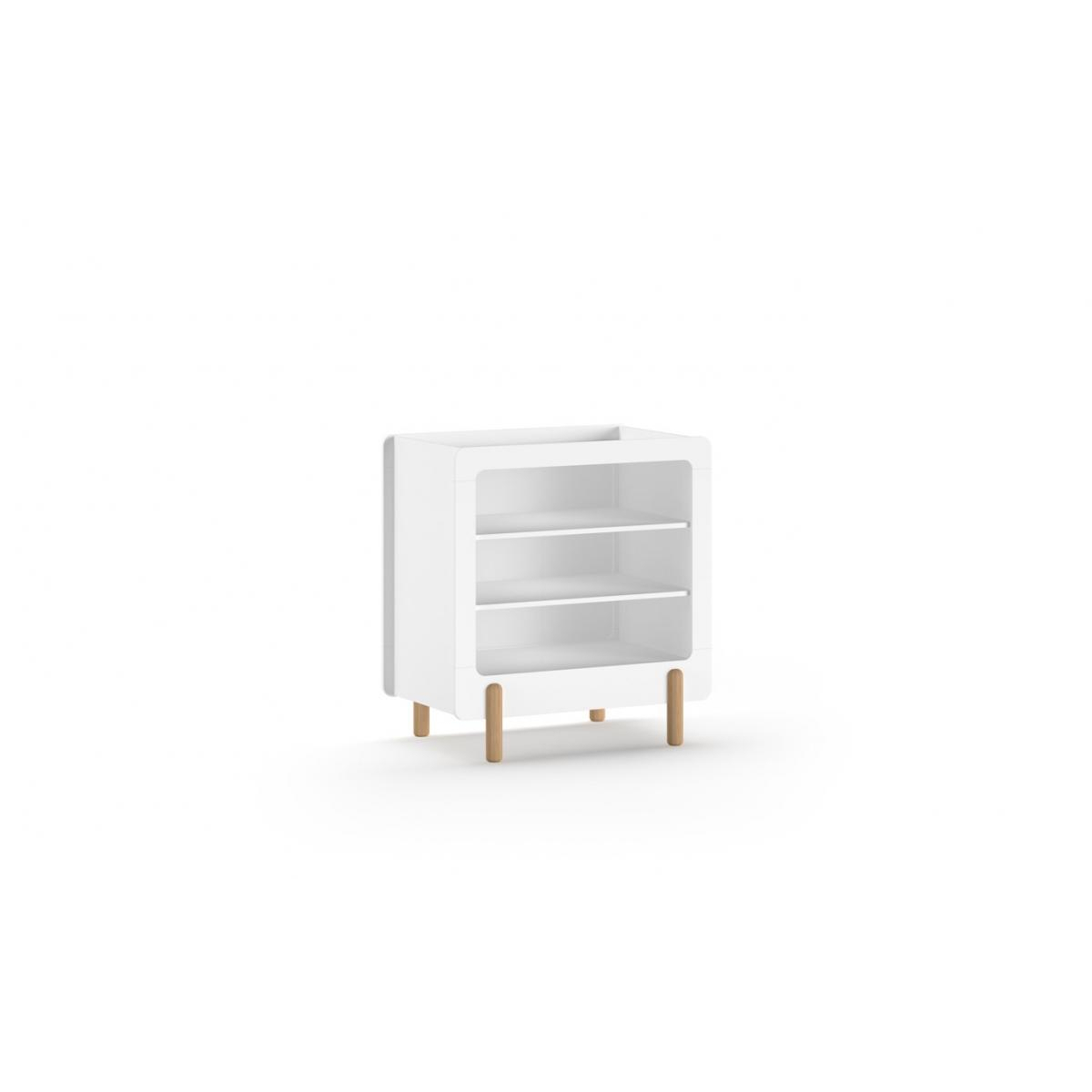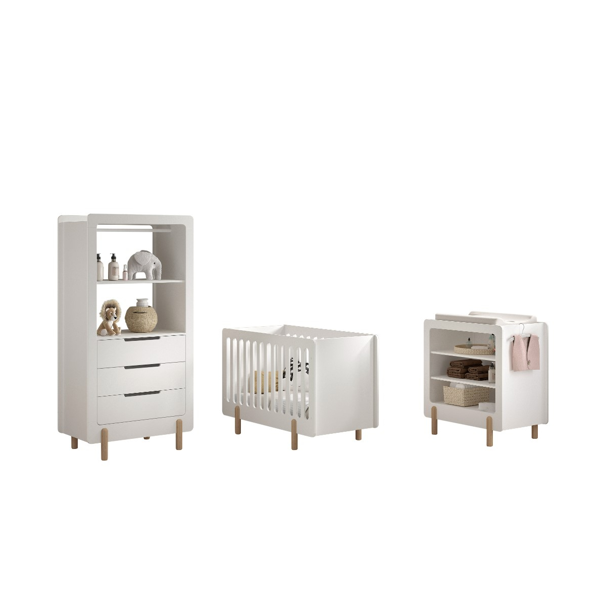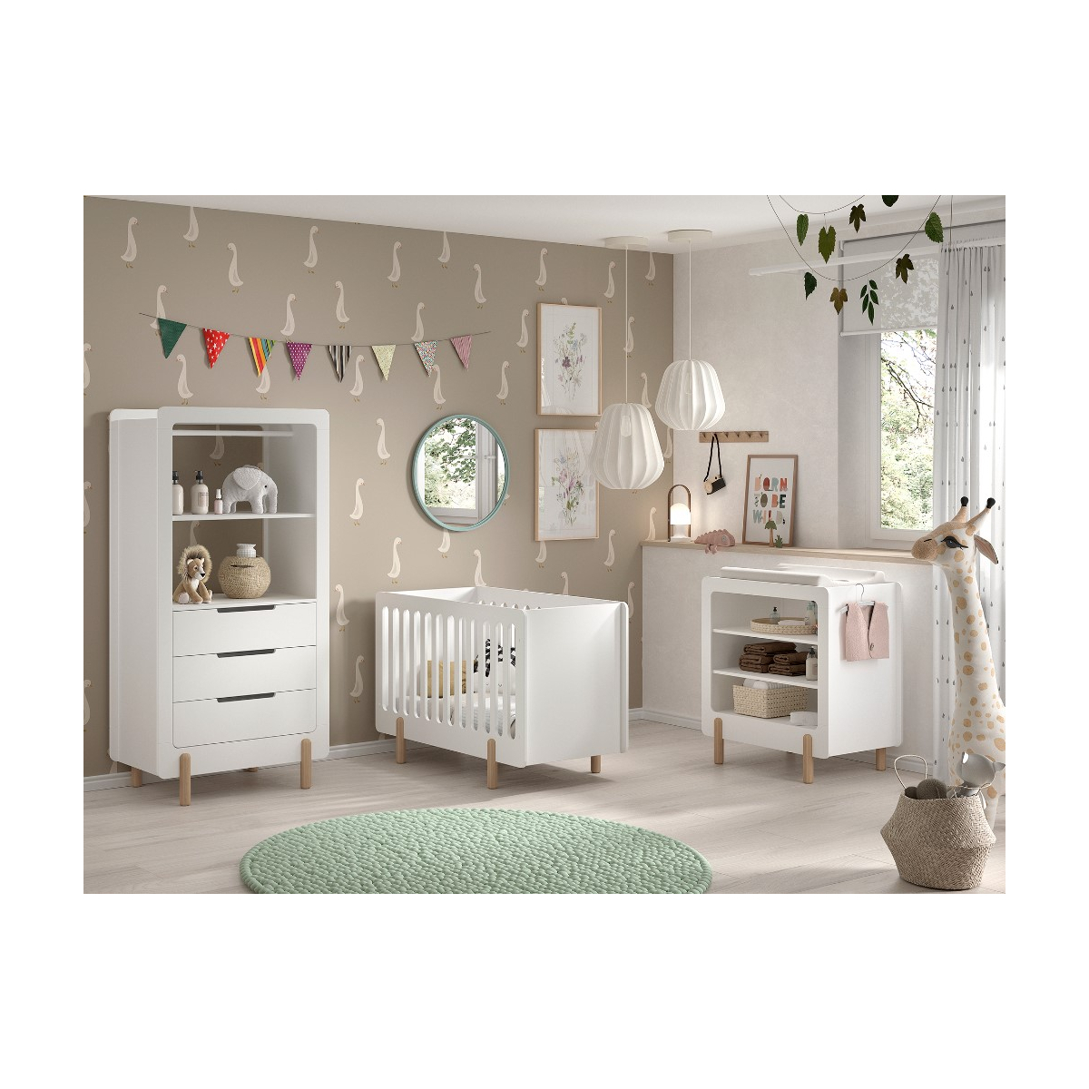 | Plus produit | Armoire blanche avec 3 tiroirs et un espace ouvert, lit de bébé blanc 160x80, commode blanche avec 2 étagères, pieds ronds naturels ajoutent une touche de charme. |