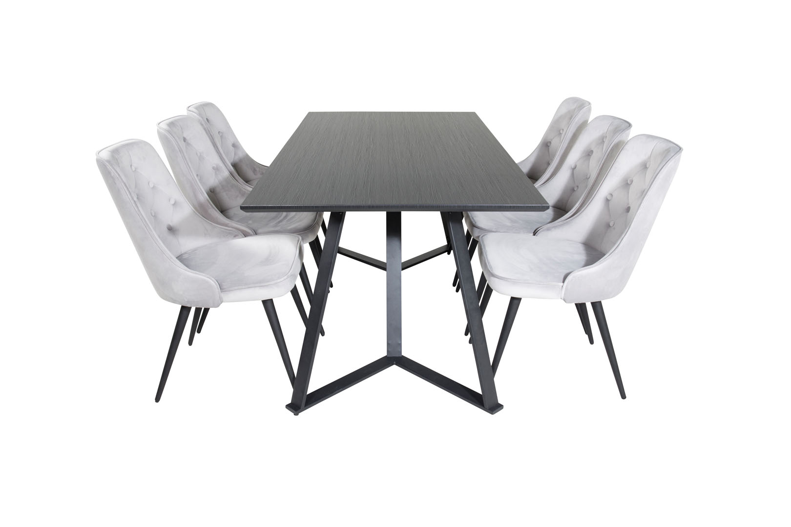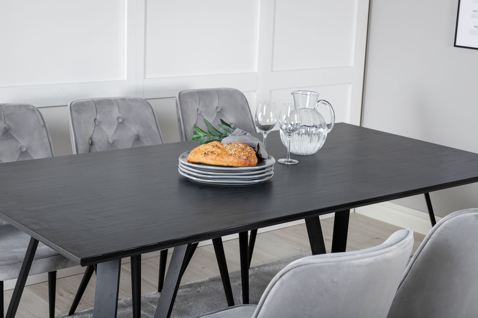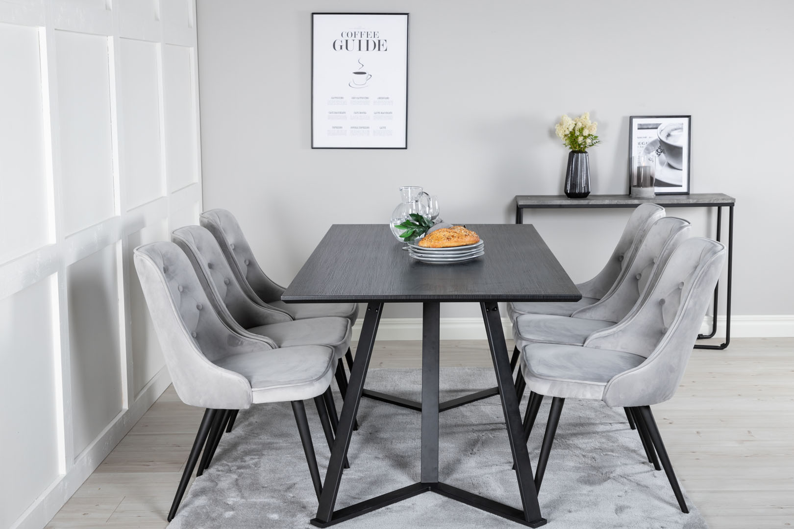 MarinaBLBL ensemble de table à manger table à manger noir et 6 chaises Velvet Deluxe velours gris clair est un ensemble de table à manger en couleur qui apporte à la fois style et fonctionnalité à votre maison. Ensemble de table à manger MarinaBLBL, table à manger noire et 6 chaises Velvet Deluxe en velours gris clair. Carte de marina 60-19925-088. Tableau cm : L180 x P90 x H75. Table : MDF, acier. Chaise de luxe en velours 60-19935-885. Quantité 6 pièces. Chaise cm : L50 x H88,5 x P66. Hauteur d'assise cm: 49. Profondeur d'assise cm: 49. Largeur d'assise cm: 50. Poids max kg.: 150. Tissu. Velours. Chaise : velours 100 % polyester, contreplaqué, mousse, acier. Ce produit est créé avec un souci du détail, ce qui garantit à la fois un attrait esthétique et une grande durabilité. Il est conçu dans un souci à la fois de fonctionnalité et de style, ce qui en fait le choix parfait pour n’importe quelle pièce de votre maison. Les matériaux utilisés sont de haute qualité, ce qui confère au produit une longue durée de vie et lui permet de résister à une utilisation quotidienne. Que ce soit pour le rangement ou comme ajout décoratif, ce produit rehaussera votre décor et apportera plus de confort et d'élégance à votre maison.