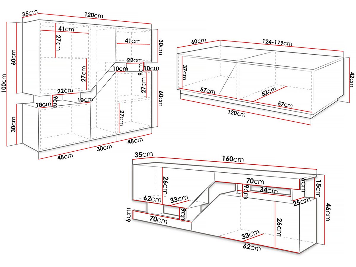 Descriptif:Ensemble de salon Ceelias - Buffet haut + table basse + meuble tv - Gris/Marron.Type de produits:Ensemble de salon.Matière:Panneau de particules stratifié 16 mm.Couleur:Noir/Marron.Pied:Pas de pieds.Finition:Mat et vernis.Porte:- Buffet avec 4 portes avec système d'ouverture push to open- Meuble tv avec 2 volets ouvrables vers le bas grâce à deux vérins à gaz- Table basse avec plateau coulissant.Style:Moderne.Dimensions:- Buffet haut : 120 x 100 x 35 cm- Table basse : 124 x 42 x 60 cm- Meuble tv : 160 x 46 x 35 cm.Poignée:Pas de poignée.Epaisseur:16 mm.Poids:- Buffet haut : 44 kg - Table basse : 39 kg- Meuble tv : 31 kg.Rangement:- Buffet haut disposant de 2 étagères et 6 casiers de rangement- Table basse disposant de 2 espaces de rangement.Le plus produit:- Design moderne qui se fond dans tout type d'intérieur - Système d'ouverture push to open pratique.- Résistant à l'humidité et aux rayures.Conseils d'entretien:Pour l'entretien de ces produits, il est conseillé de les nettoyer à l'aide d'un chiffon doux et sec légèrement humidifié d'eau savonneuse.Conseils pratique:Charge maximale supportée de chaque produit : 30 kg.Garantie:24 mois.Colisage:3 colis : - 1,68 x 0,4 x 0,1 m, 30 kg - 1,24 x 0,88 x 0,083 m, 40 kg - 1,24 x 0,785 x 0,08 m, 46 kg.