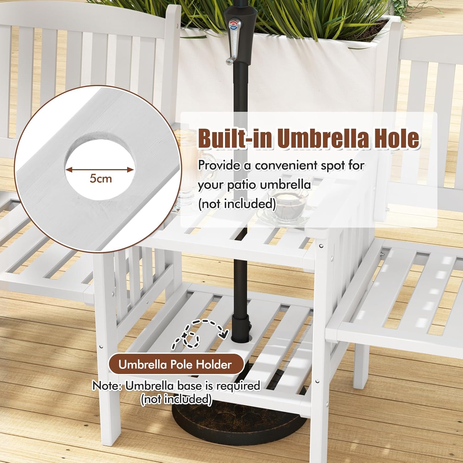 Ensemble de salon de jardin en une pièce, bois massif, 1 table avec trou pour parasol & 2 fauteuils blanc