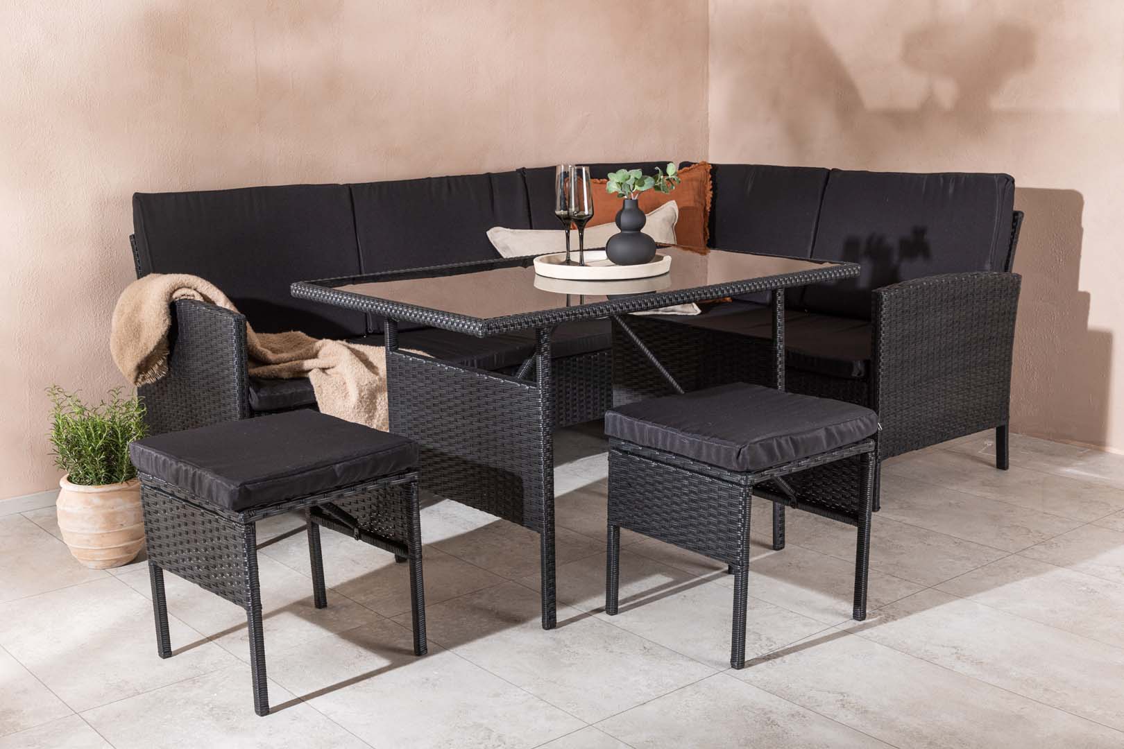 Knock lounge set 4 parts black est un meuble lounge de couleur noire qui apporte à la fois style et fonctionnalité à votre maison. Ensemble de salon Knock 4 parties noir. Canapé d'angle noir incl. coussins, y compris repose-pieds, L X H X P cm : 145/135/73/56, Hauteur d'assise cm : 34, Profondeur d'assise cm : 56. Table noire, L X H X P cm : 70/65/110. Ce produit est créé avec un souci du détail, ce qui garantit à la fois un attrait esthétique et une grande durabilité. Il est conçu dans un souci à la fois de fonctionnalité et de style, ce qui en fait le choix parfait pour n’importe quelle pièce de votre maison. Les matériaux utilisés sont de haute qualité, ce qui confère au produit une longue durée de vie et lui permet de résister à une utilisation quotidienne. Que ce soit pour le rangement ou comme ajout décoratif, ce produit rehaussera votre décor et apportera plus de confort et d'élégance à votre maison.